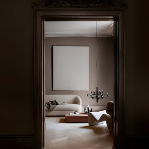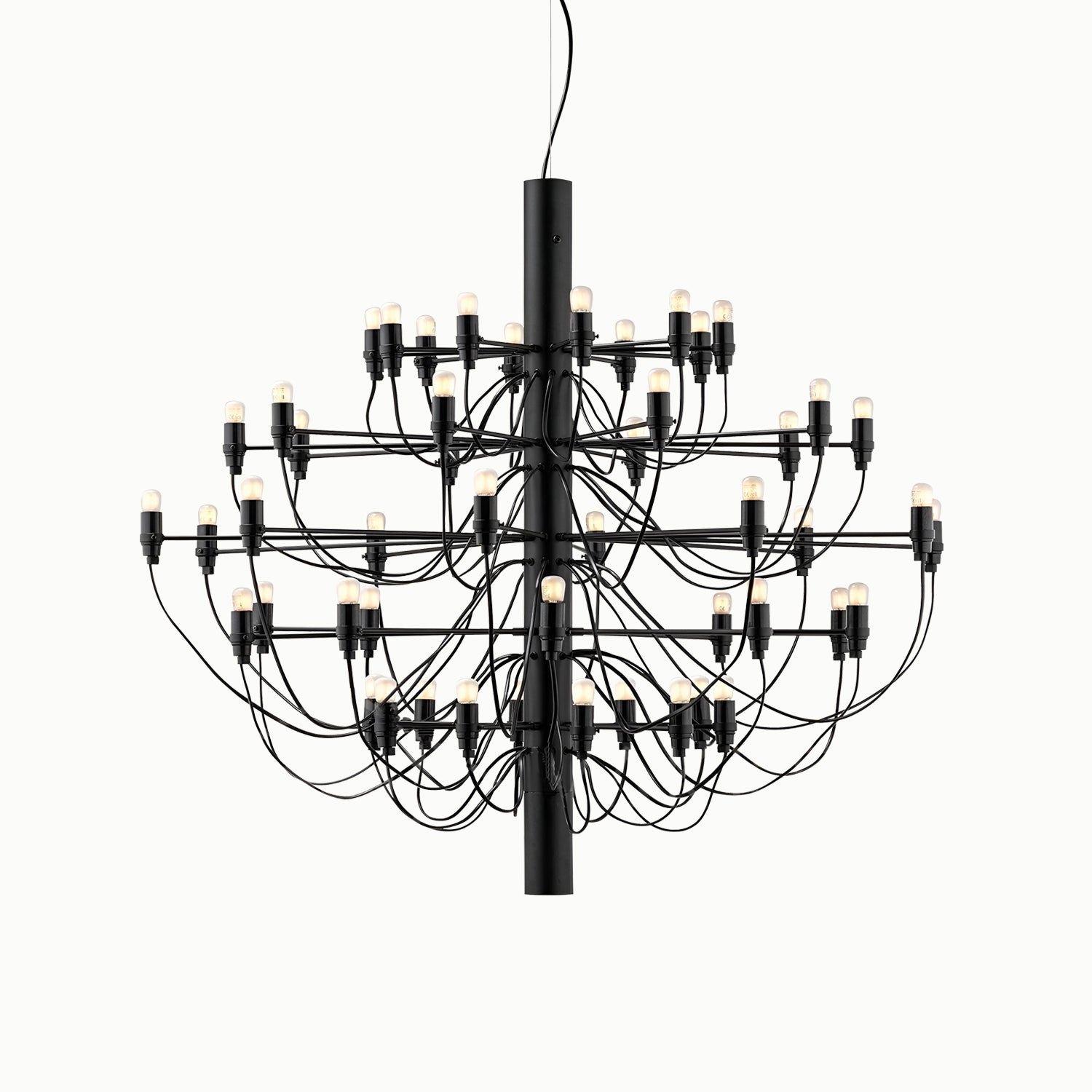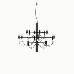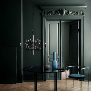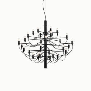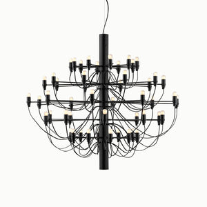 The 2097/30 is a suspension lamp that provides diffused light. The central structure is made of steel with brass arms, available in chrome-plated, matte black, matte white, or gold finishes. The lamp's ceiling fitting and canopy are also made of steel.
