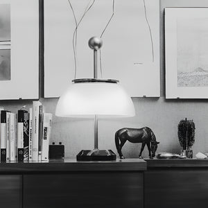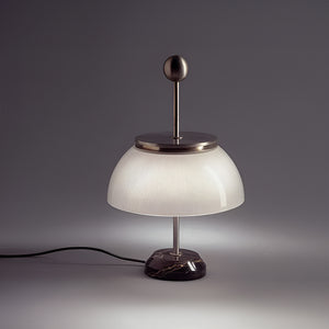 The metal structure is made of opaque nickel-plated material, the diffuser is made of crystal glass, and the base is marble. The metal parts are hand-turned.
