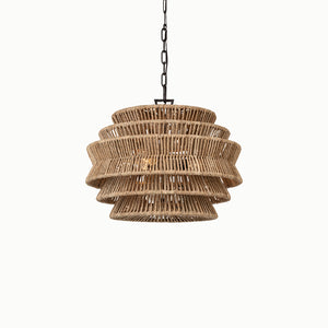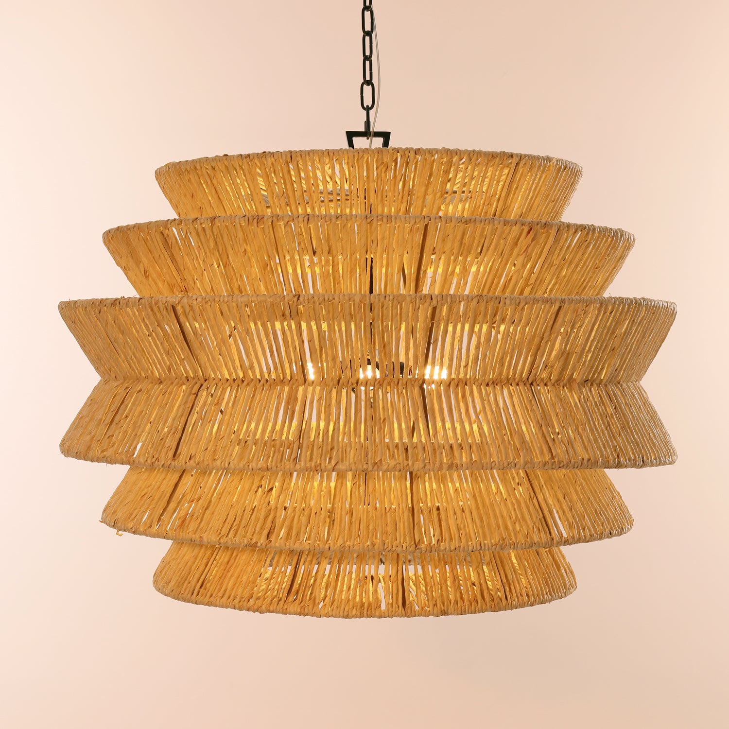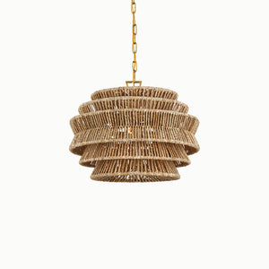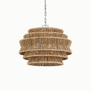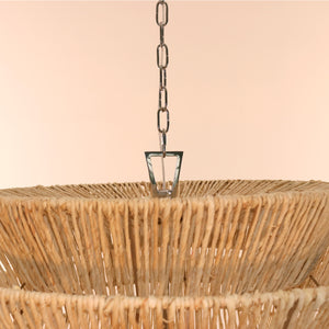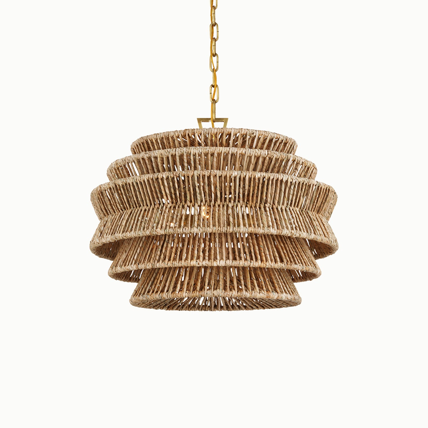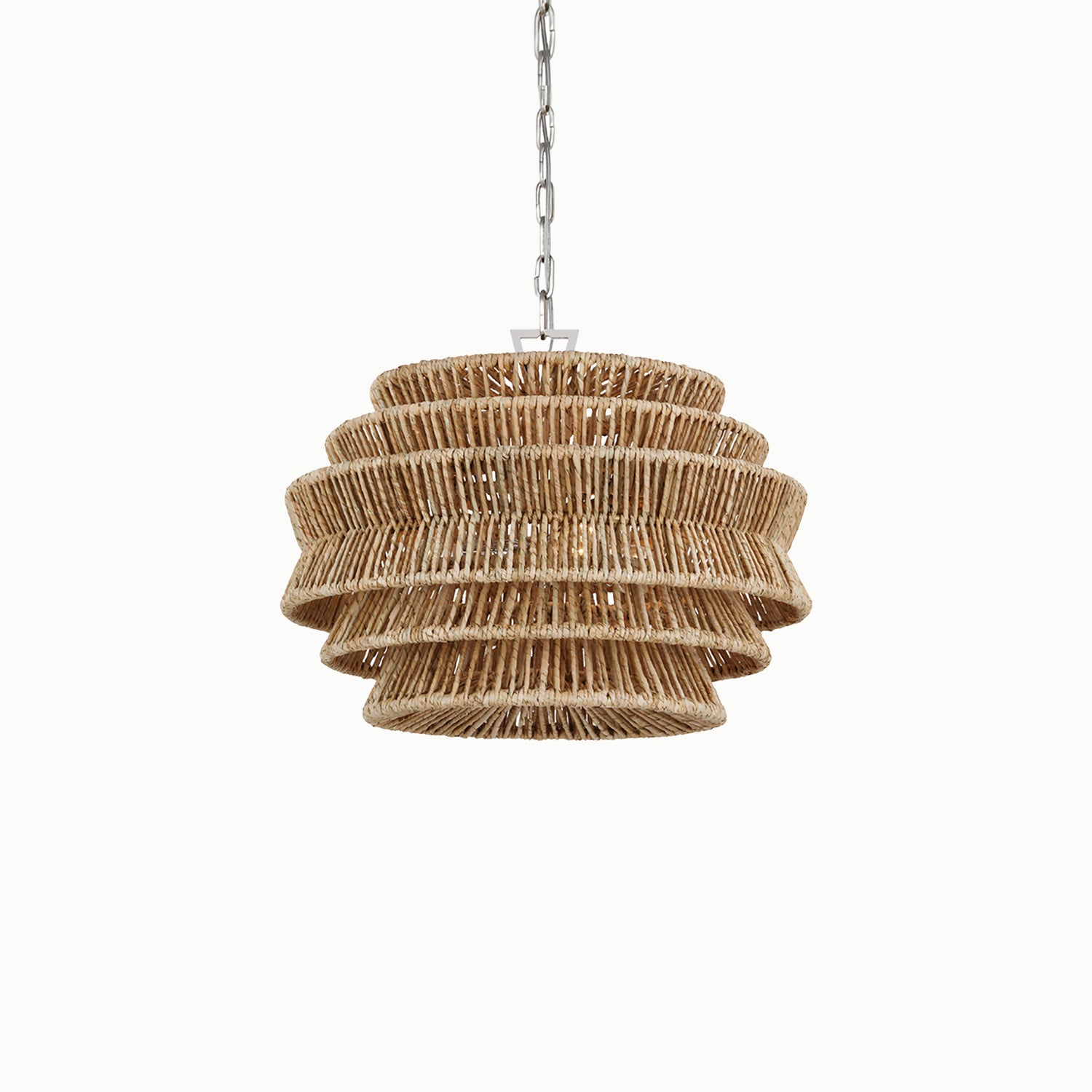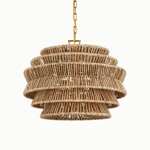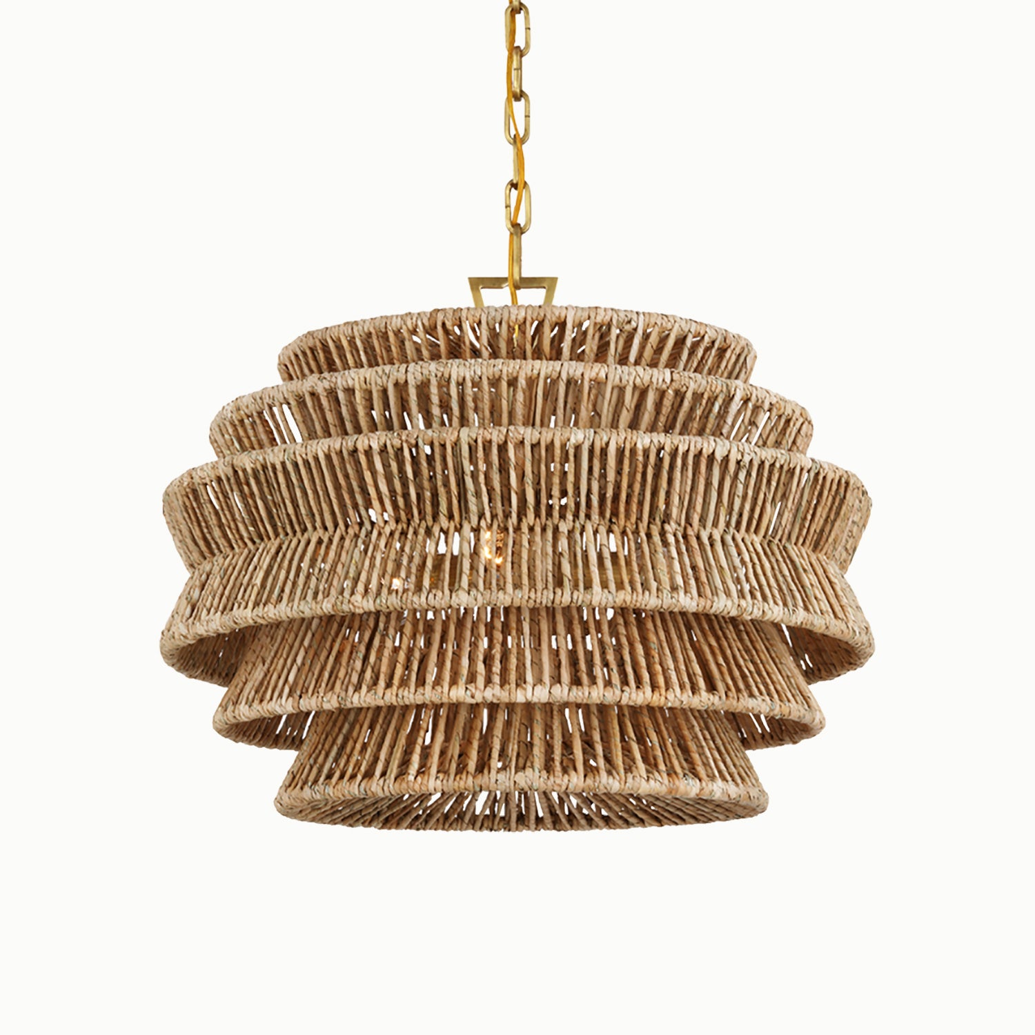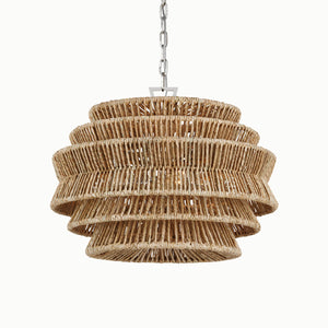 The Antigua Drum Chandelier showcases meticulous craftsmanship and a nature-inspired aesthetic. Its expansive drum-shaped shade features a tiered design and is handcrafted with natural abaca fibers. Multiple LEDs emit a soft glow through the angled frame, creating a light effect reminiscent of sunlight filtering through palm leaves.The organic texture and subtle variations of the abaca add a unique, natural charm to the fixture, making each piece a one-of-a-kind addition to any space. With its damp-rated design, it is resistant to mild moisture, making it an ideal choice for patios and verandas, as well as indoor spaces that call for a touch of natural elegance and sophistication.