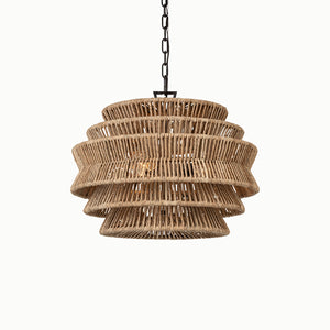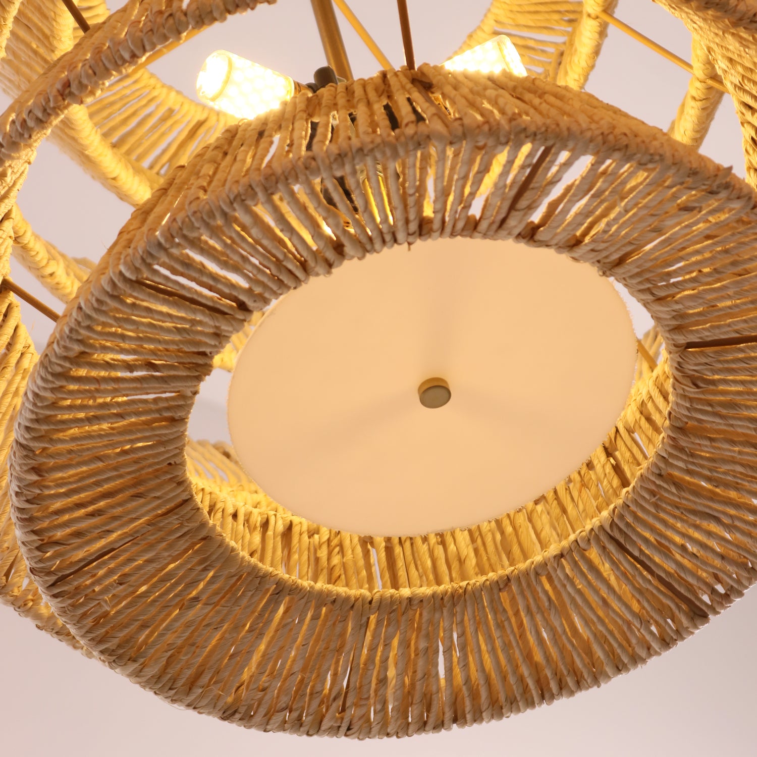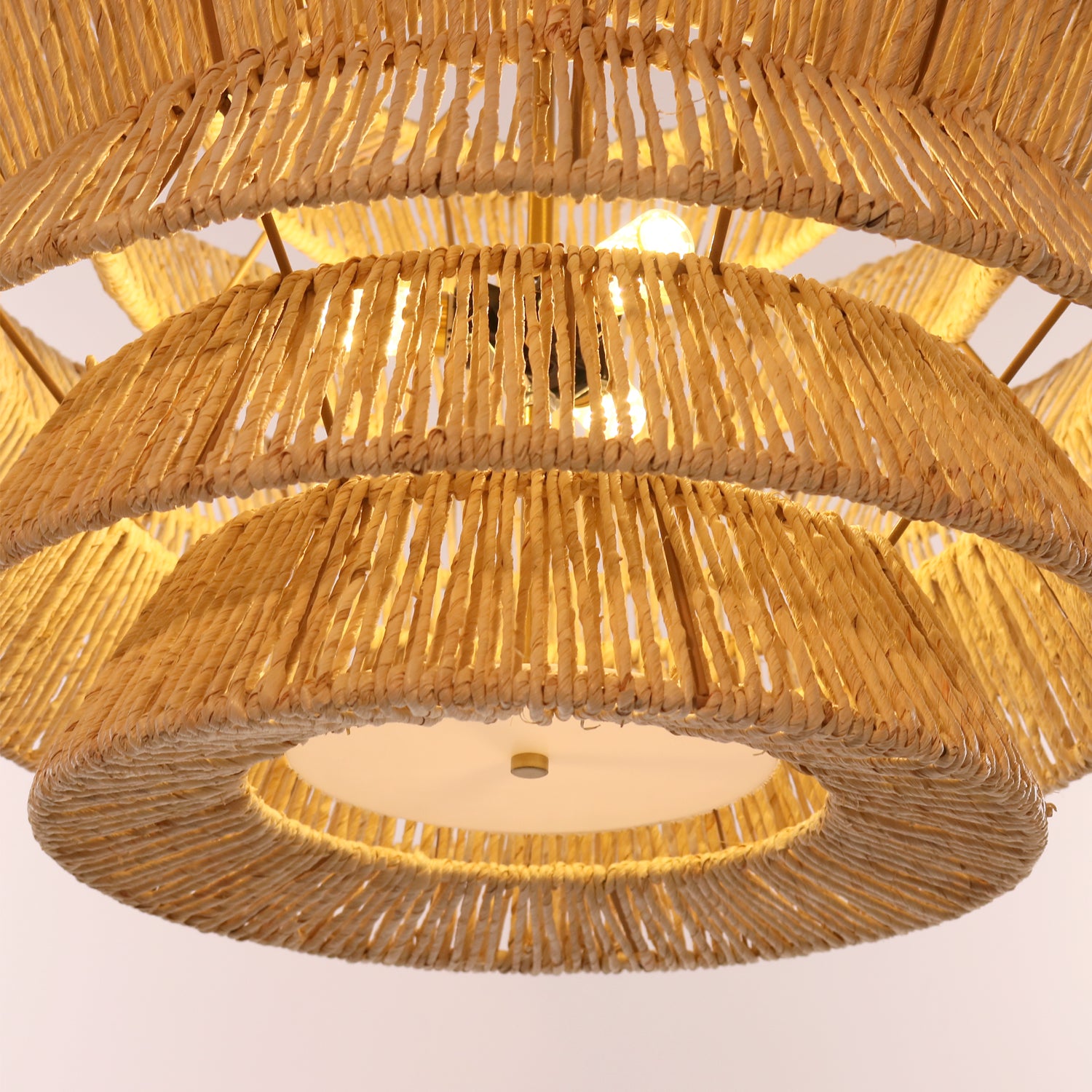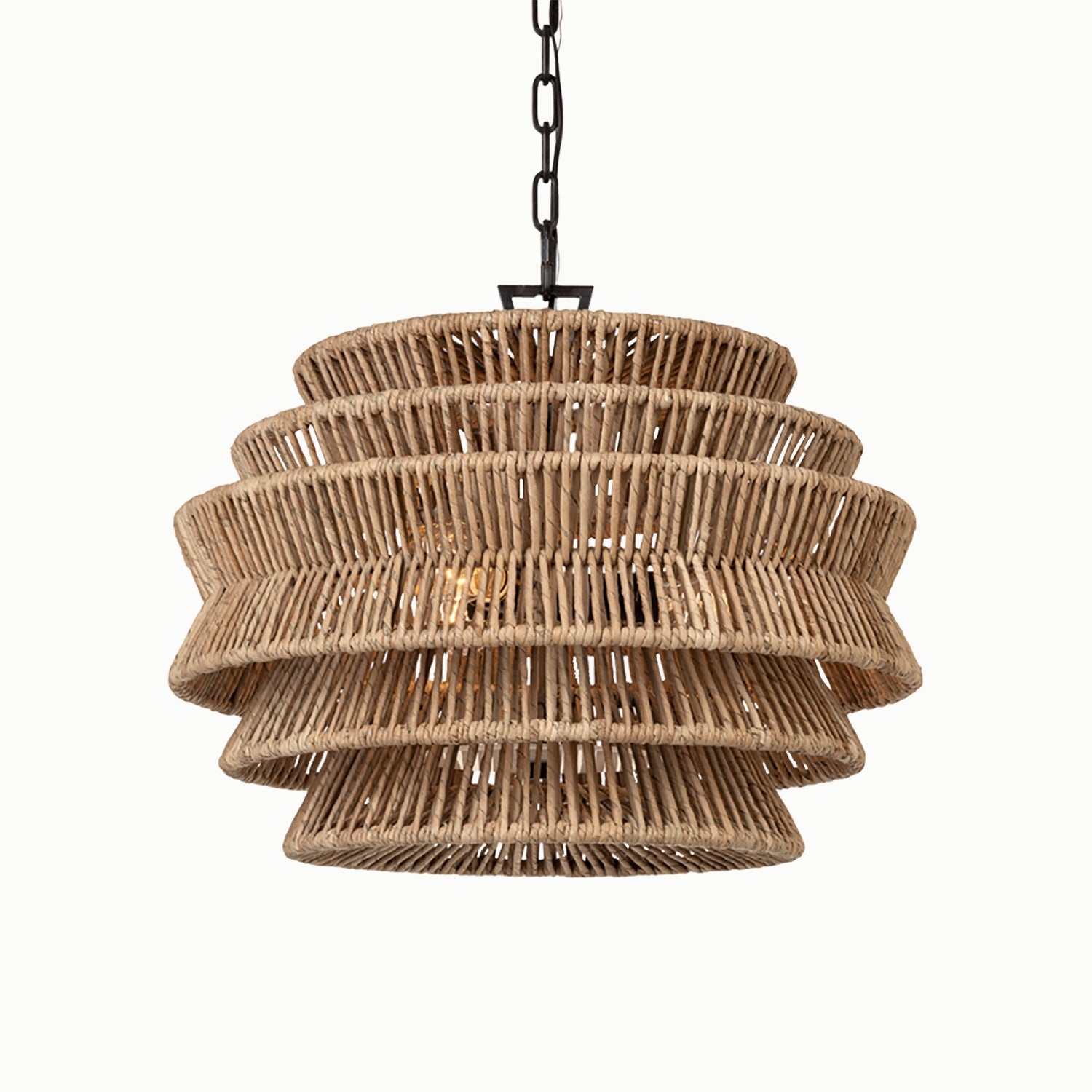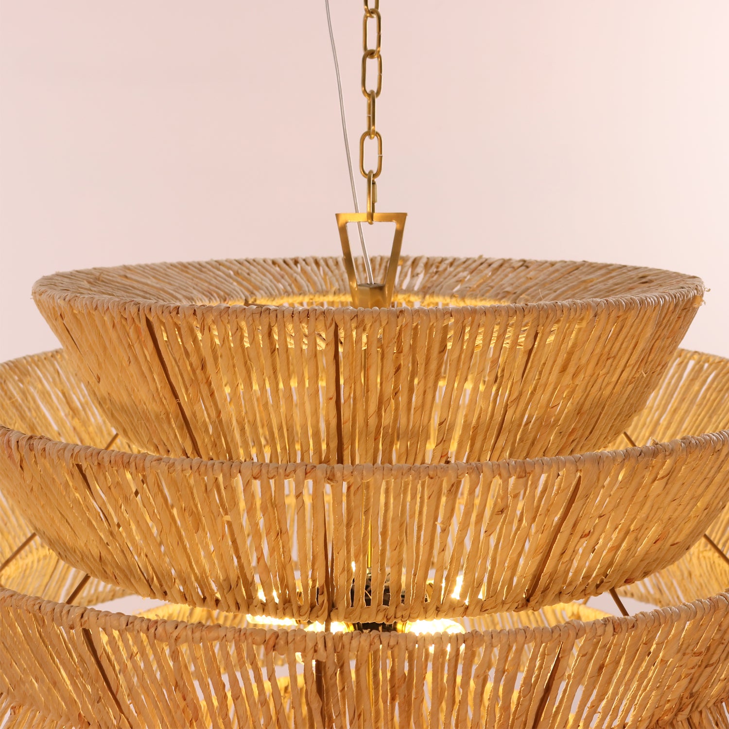 The Antigua Drum Chandelier showcases meticulous craftsmanship and a nature-inspired aesthetic. Its expansive drum-shaped shade features a tiered design and is handcrafted with natural abaca fibers. Multiple LEDs emit a soft glow through the angled frame, creating a light effect reminiscent of sunlight filtering through palm leaves.The organic texture and subtle variations of the abaca add a unique, natural charm to the fixture, making each piece a one-of-a-kind addition to any space. With its damp-rated design, it is resistant to mild moisture, making it an ideal choice for patios and verandas, as well as indoor spaces that call for a touch of natural elegance and sophistication.