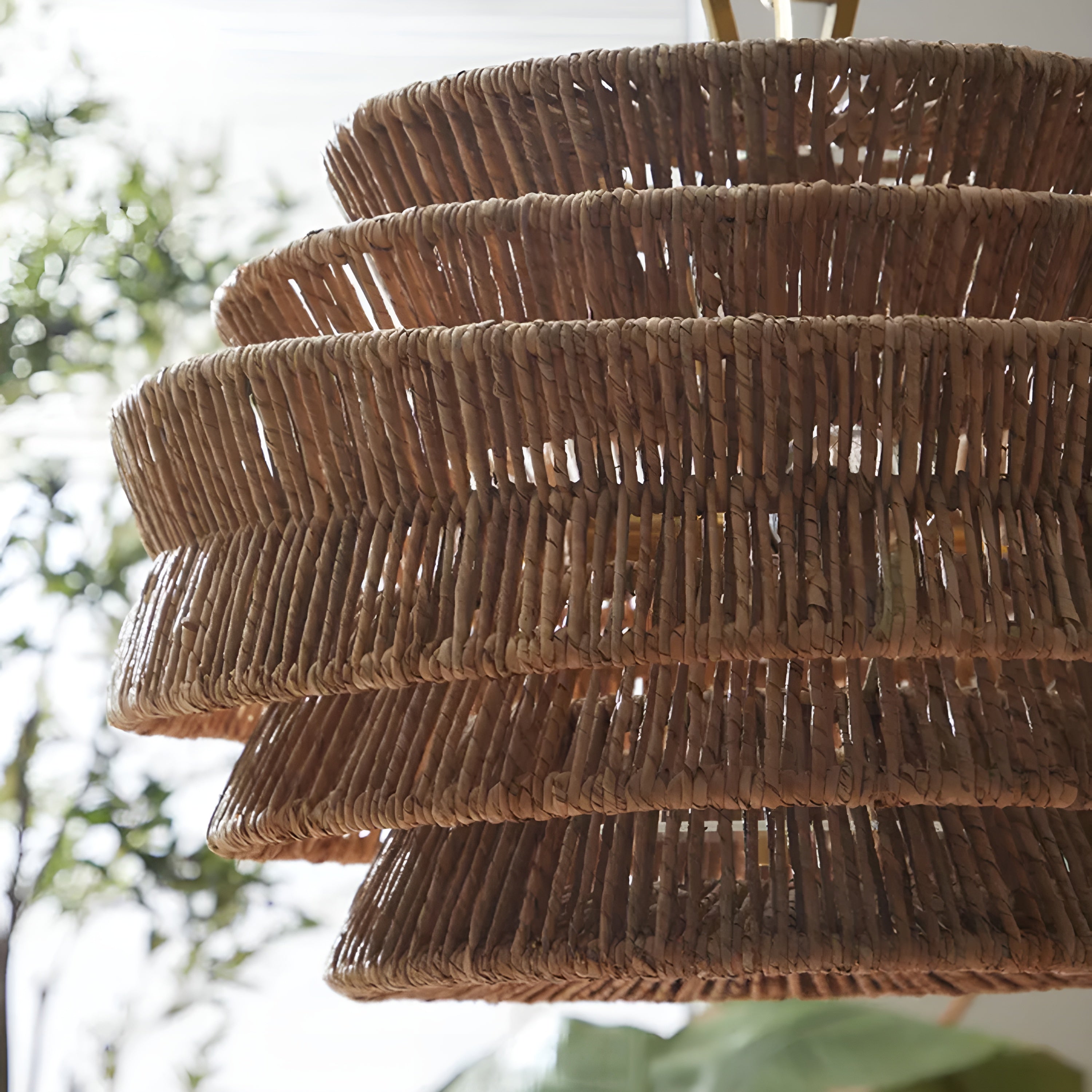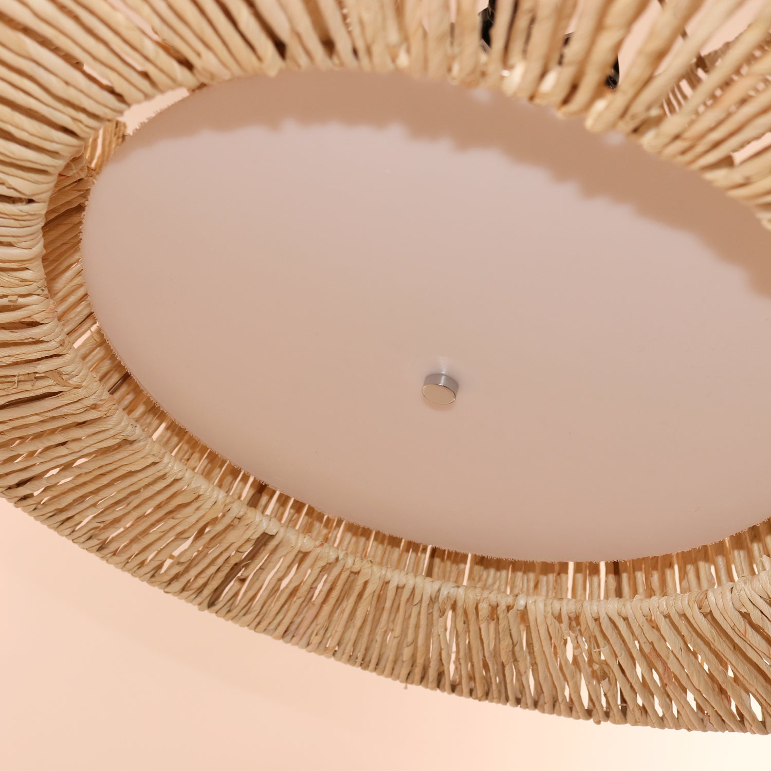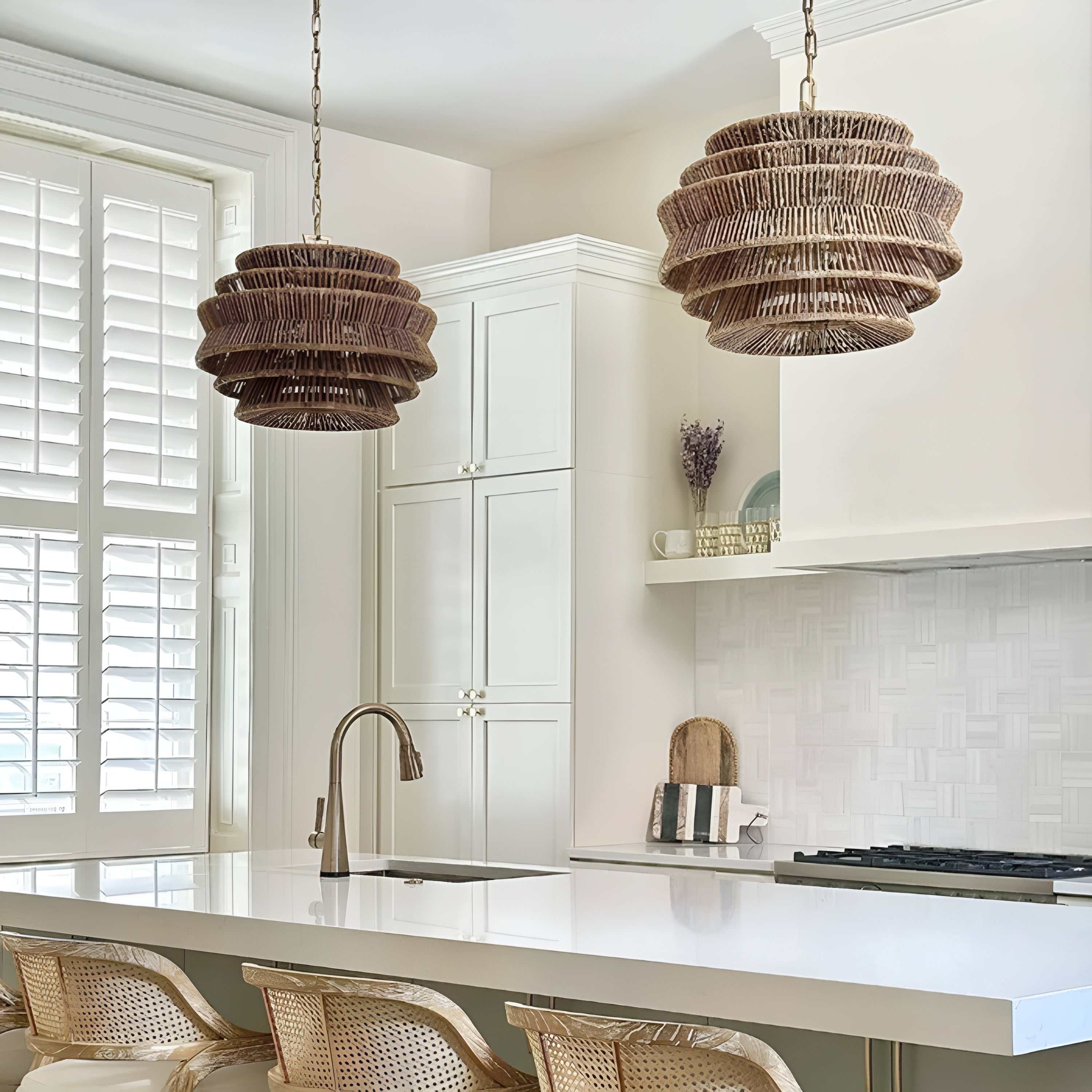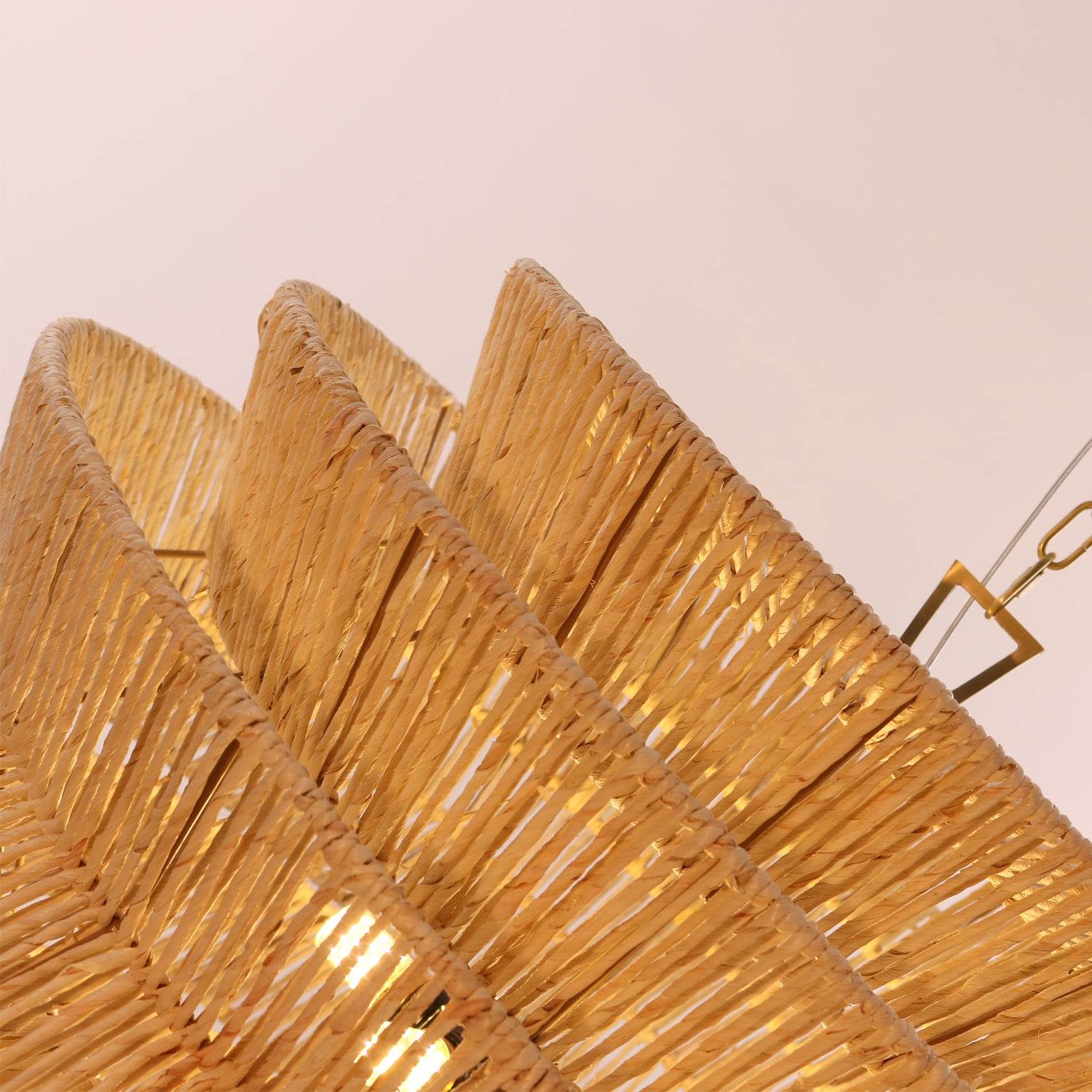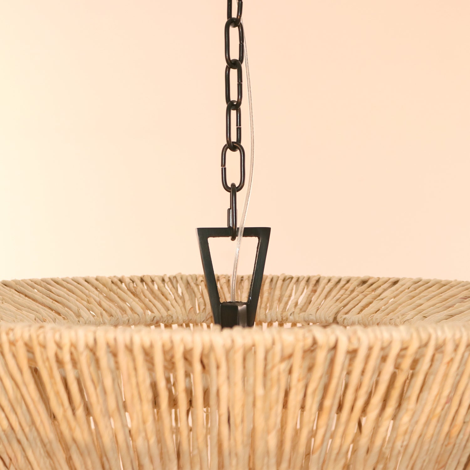 The Antigua Drum Chandelier showcases meticulous craftsmanship and a nature-inspired aesthetic. Its expansive drum-shaped shade features a tiered design and is handcrafted with natural abaca fibers. Multiple LEDs emit a soft glow through the angled frame, creating a light effect reminiscent of sunlight filtering through palm leaves.The organic texture and subtle variations of the abaca add a unique, natural charm to the fixture, making each piece a one-of-a-kind addition to any space. With its damp-rated design, it is resistant to mild moisture, making it an ideal choice for patios and verandas, as well as indoor spaces that call for a touch of natural elegance and sophistication.
