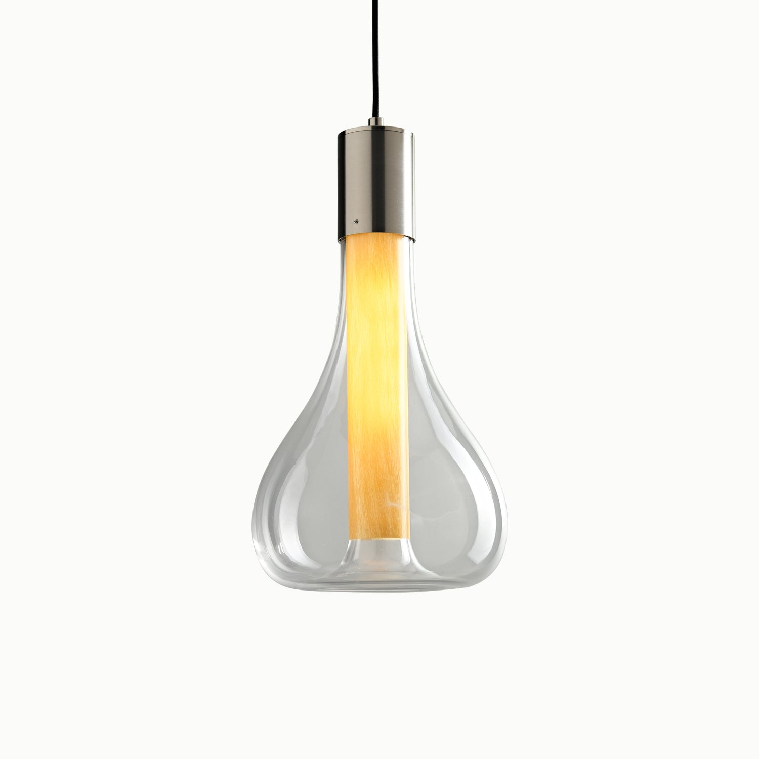 With its minimal, orb-like shape and tranquil presence, Eris exudes an ethereal beauty. Designed by Mayice, Eris features several distinct components: a natural wood veneer tube encased within a hand-blown borosilicate glass orb, and is completed with a contrasting metal base. As a perfect accent lamp, Eris emits a soft and pleasing ambience, capturing the sublime combination of glass and wood.The Eris Suspension lamp is a masterpiece of craftsmanship, equally stunning as a solo luminaire or when arranged in a group. Its uncluttered design allows for individual self-expression.
