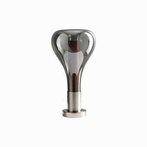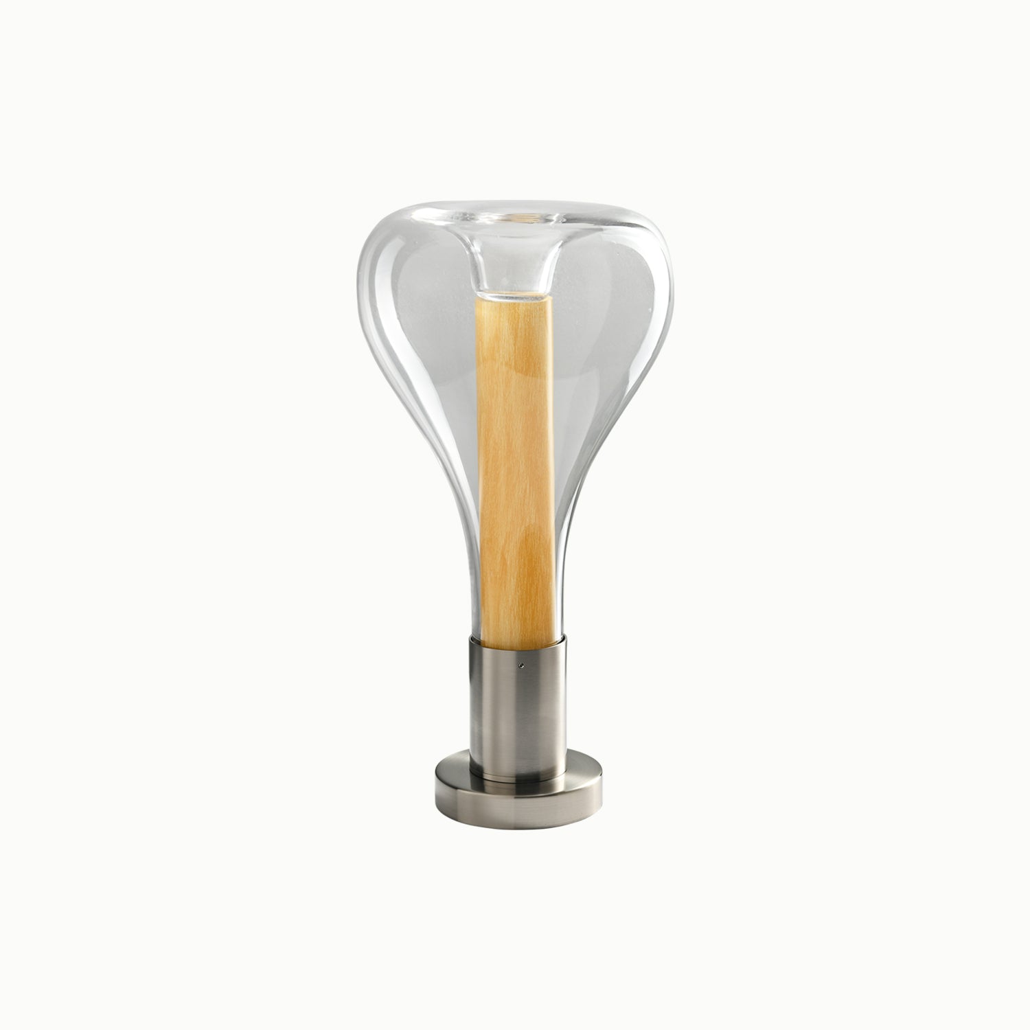 With its minimalist, orb-like design and serene presence, this lamp embodies an ethereal beauty. It features several distinct elements: a natural wood veneer tube encased in a hand-blown borosilicate glass orb, finished with a contrasting metal base. As the perfect accent lamp, it offers a soft and pleasing ambience, capturing the sublime harmony of glass and wood. In this table lamp, the interplay between light and shadow, glass and wood, is beautifully showcased. The design evokes a sense of tranquility, allowing for individual self-expression.
