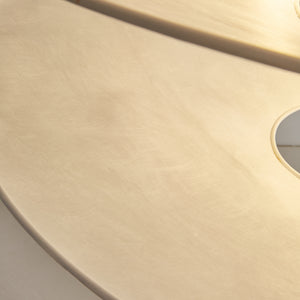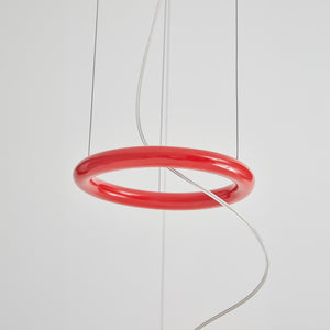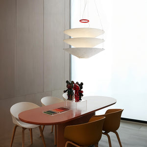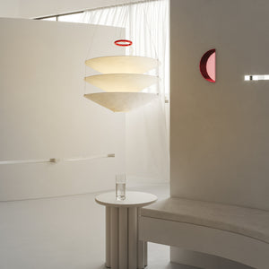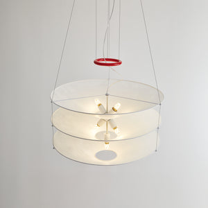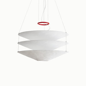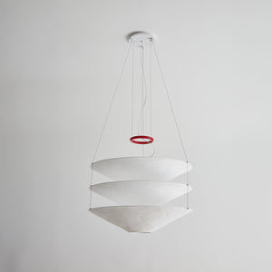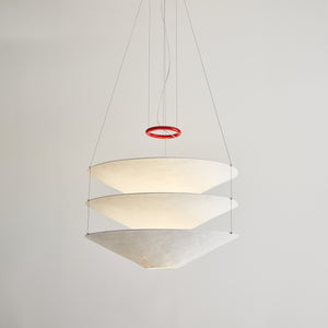Designed in 1980, this suspension light features Japanese paper shades that create a warm, ambient glow. Three handcrafted shades are delicately suspended by thin metal cables, while a red iron ring serves as both a decorative accent and a counterweight for height adjustment. The shades are intentionally crinkled, allowing the paper to respond to changes in humidity, which can affect their rigidity.