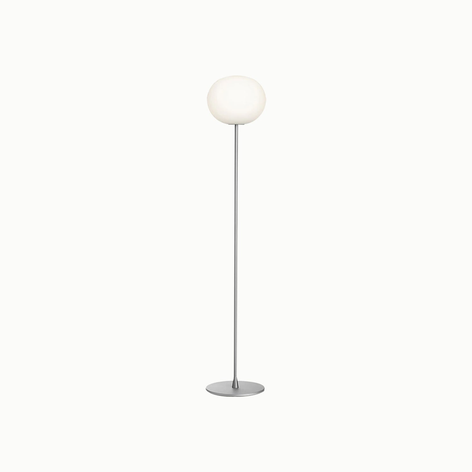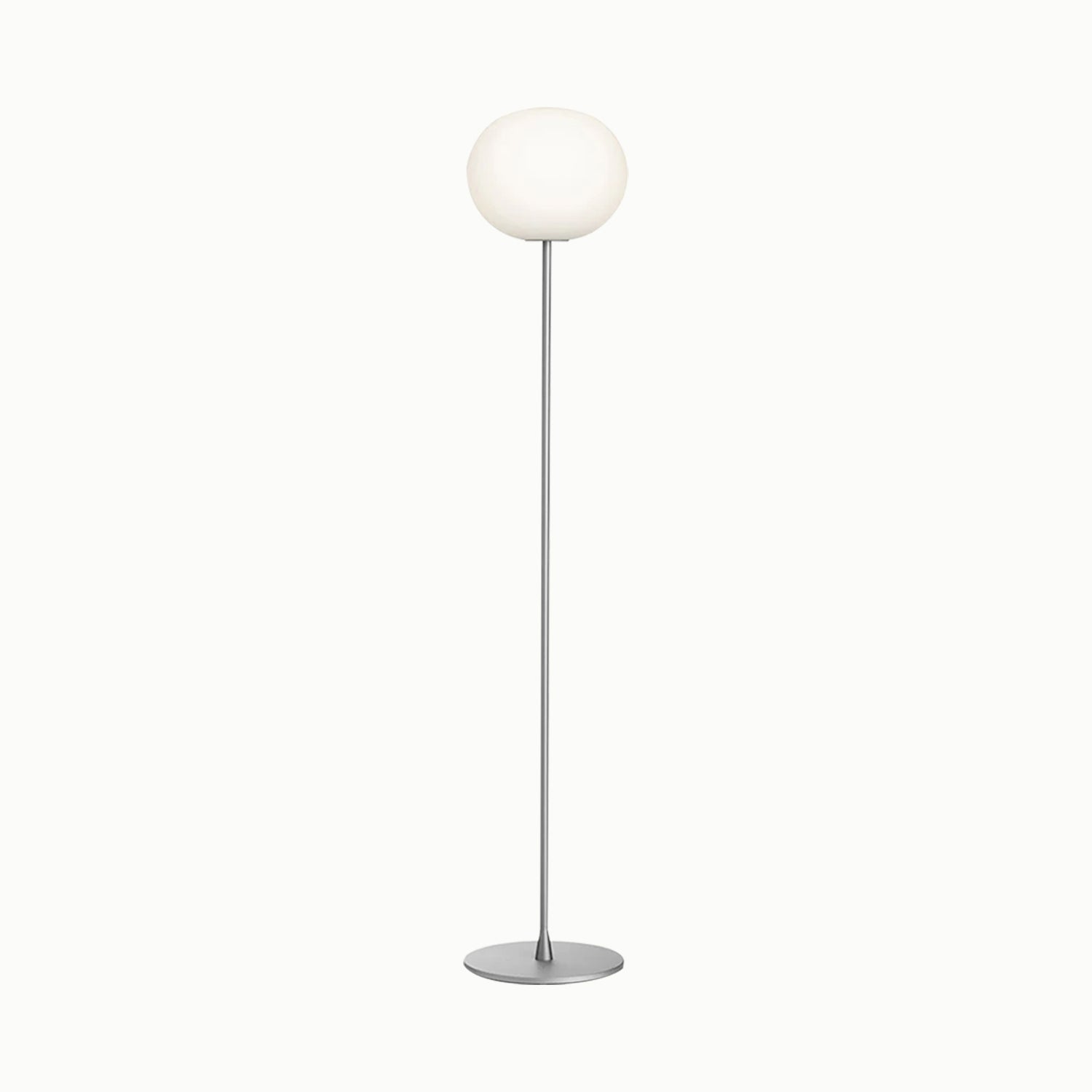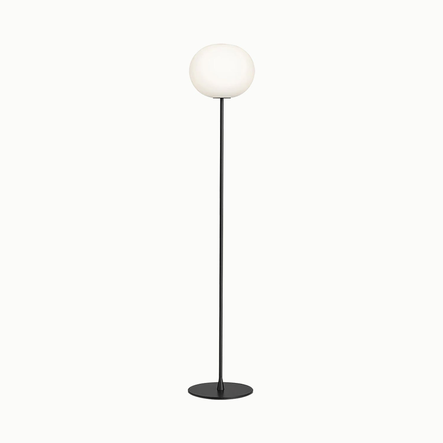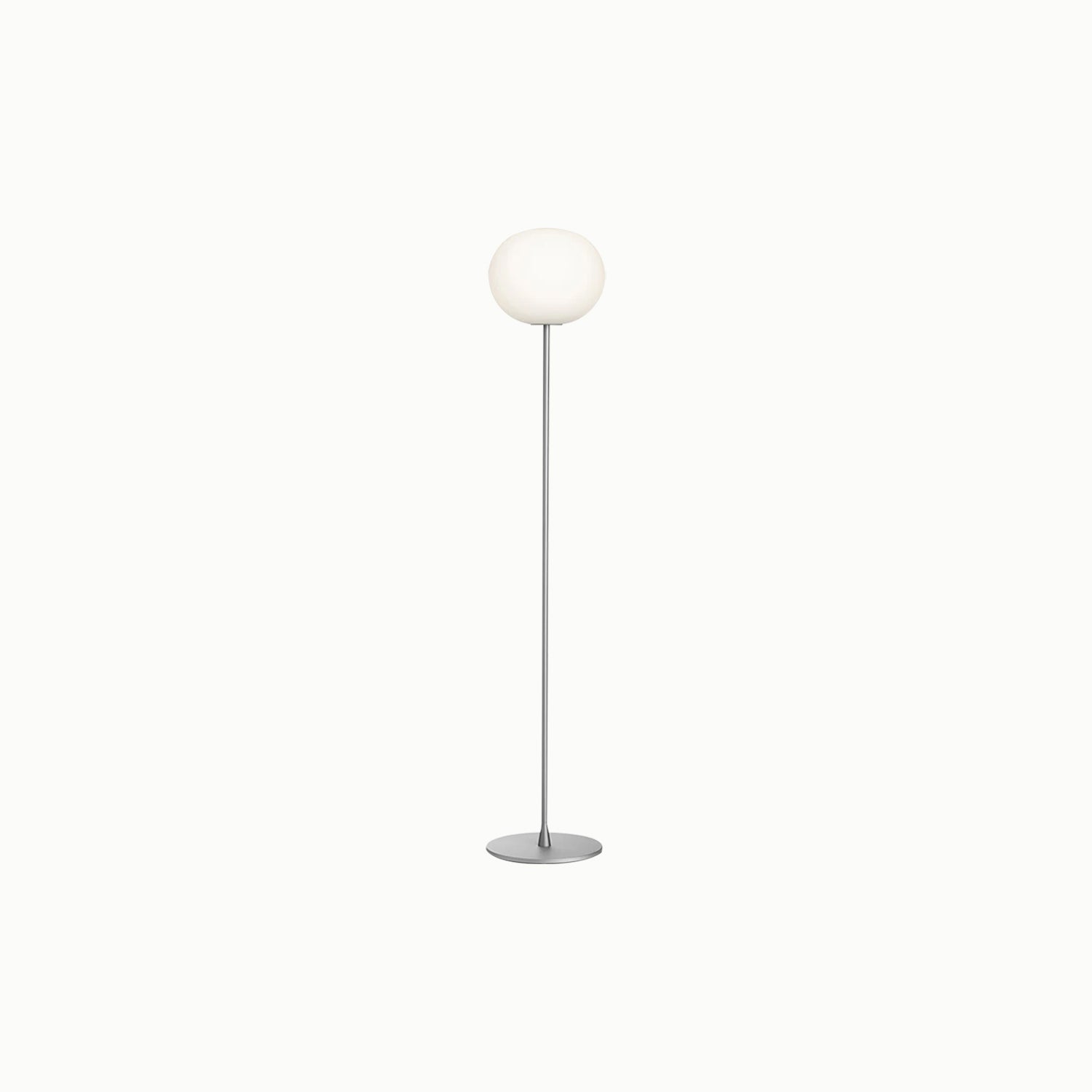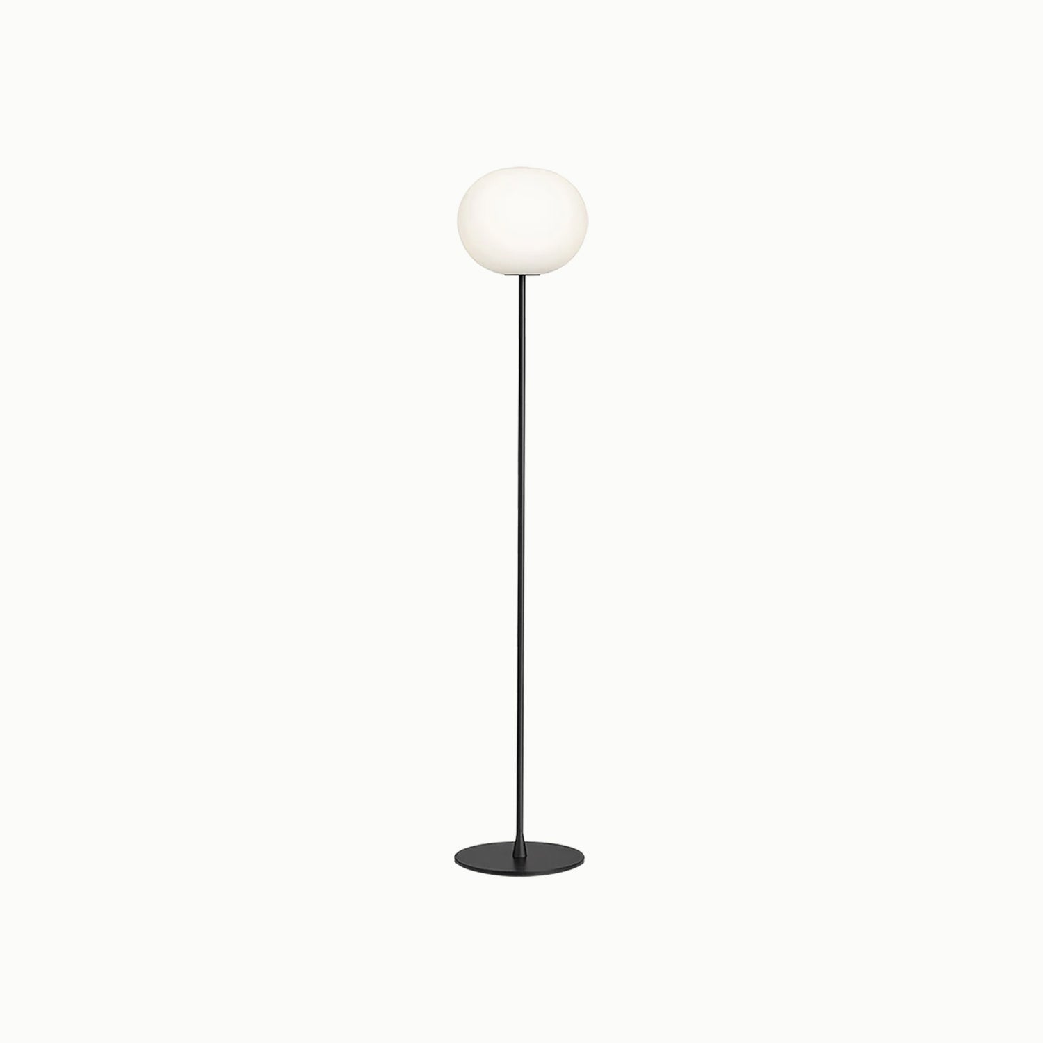 A floor lamp providing diffused light, made of hand-blown opaline glass, with a high-thickness steel base and stem painted in gray or black.