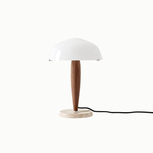 This lamp is made of opal glass, richly colored walnut, and cream-colored marble, with exquisite proportions that showcase three natural materials. Diffused light radiates through the shade and below it, creating a cozy atmosphere that evokes a sense of tranquility for those sitting beneath the shade.