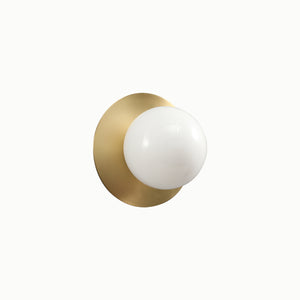 Liila 1 is a simple and minimalist wall and ceiling lamp suitable for both small and large homes. It features a round backplate in golden metal that supports an opal white glass globe, which softly diffuses light. Liila 1 Small can be used as a ceiling light in the corners of a dining room, complementing the main lighting typically centered above the dining table. All Liila 1 wall and ceiling lamps are IP44 rated and approved for bathroom use.