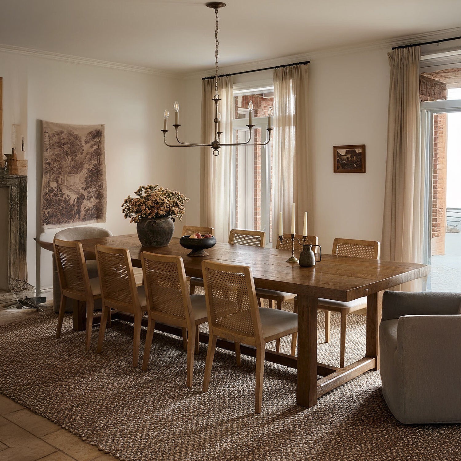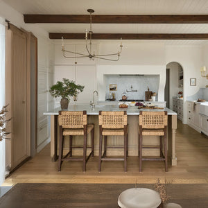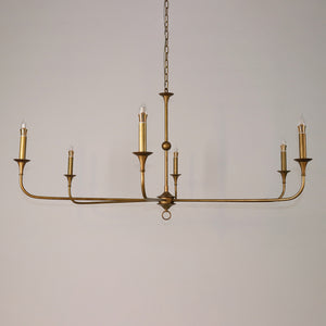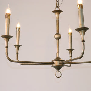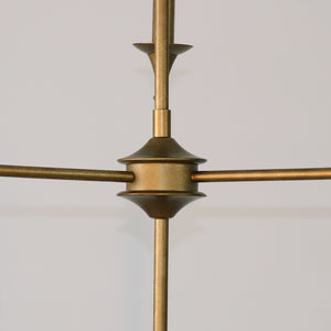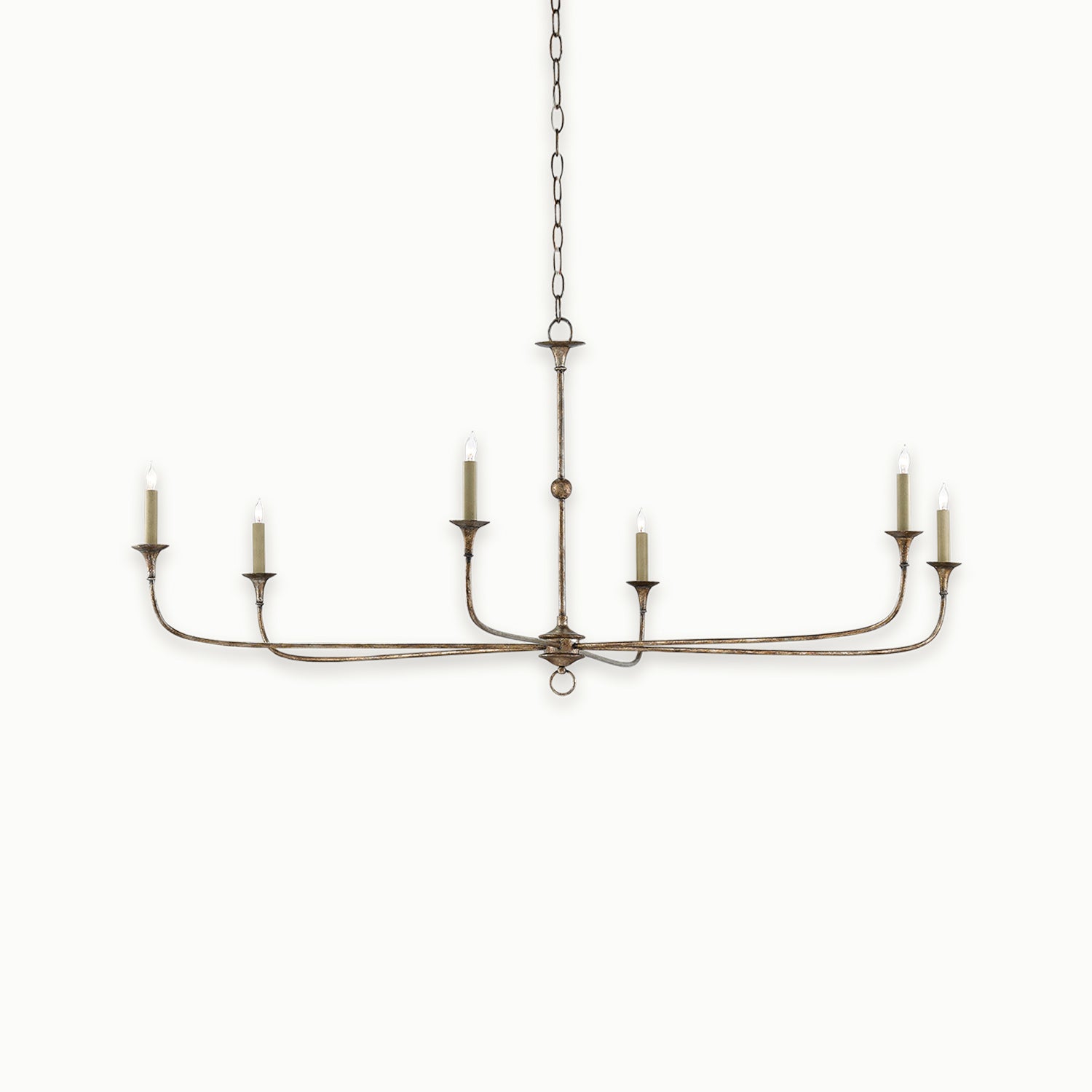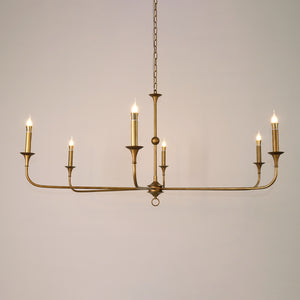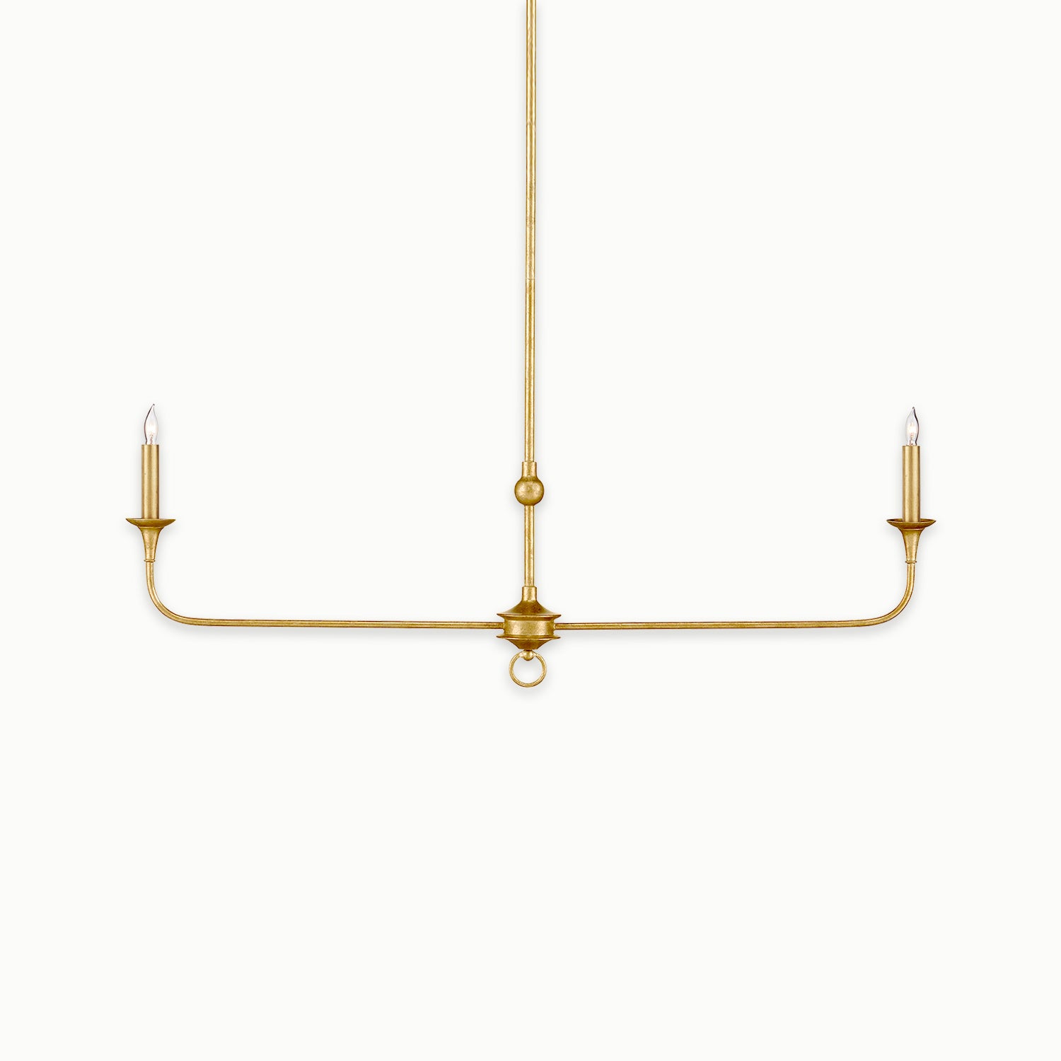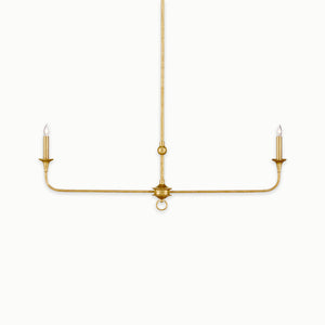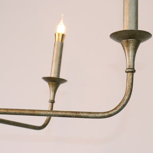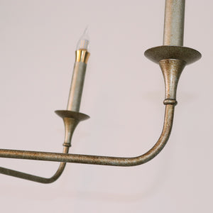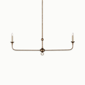 The design highlights of the linear bronze pendant light include long arms that elegantly extend from small gears and a ring that decorates its base. The fixture features a charming fluidity, while the pyrite bronze finish adds texture to the bronze pendant. The fact that the pendant hangs from a rod rather than a chain gives this design a more modern feel, even though it still clearly reflects traditional design elements. Its shape makes it particularly well-suited for placement above kitchen islands and bars.