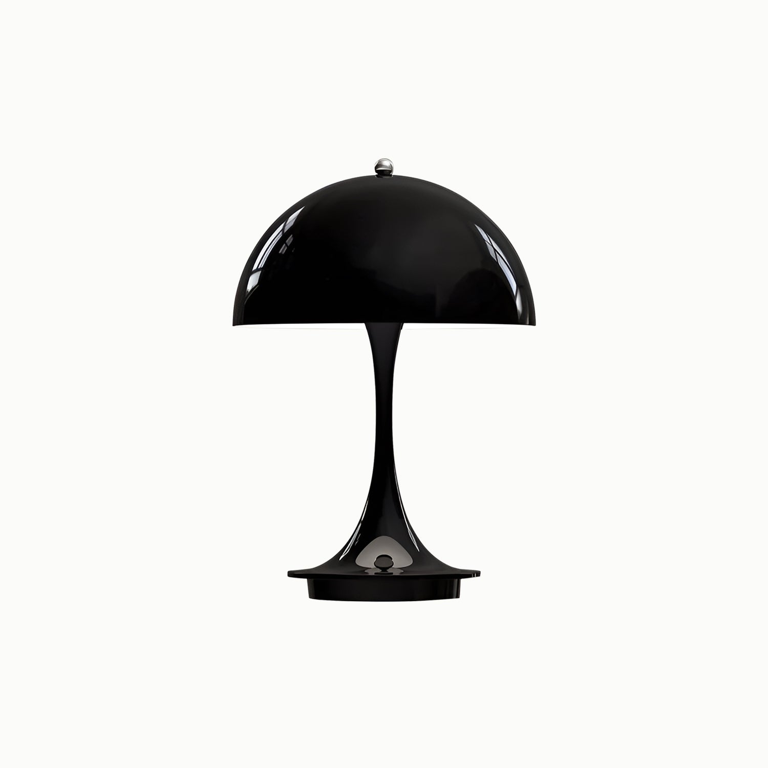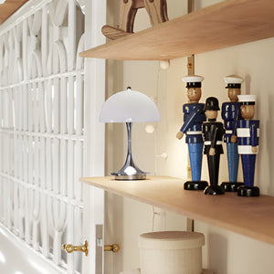 The Panthella Portable V2 portable table lamp emits a glare-free, soft, and comfortable light. The metal shade variant reflects the light downwards, providing pleasant illumination through the inner white-painted shade and the reflection from the trumpet-shaped stem. The opal acrylic variant offers soft lighting and a subtle ambiance due to its transparency and the reflection of the downward light on the inner side of the shade.