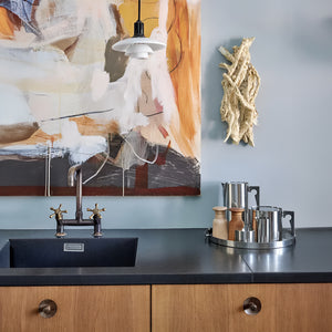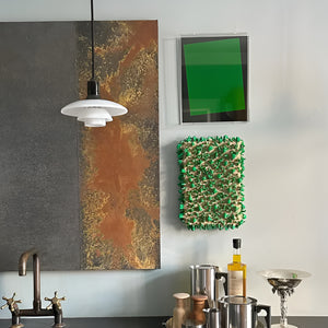 The fixture is designed based on the principle of a reflective three-shade system, directing most of the light downwards. The shades are made of hand-blown opal three-layer glass, with a glossy finish on the top and a sandblasted matte finish on the underside, resulting in a soft and even light distribution.