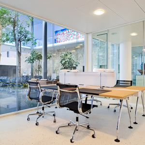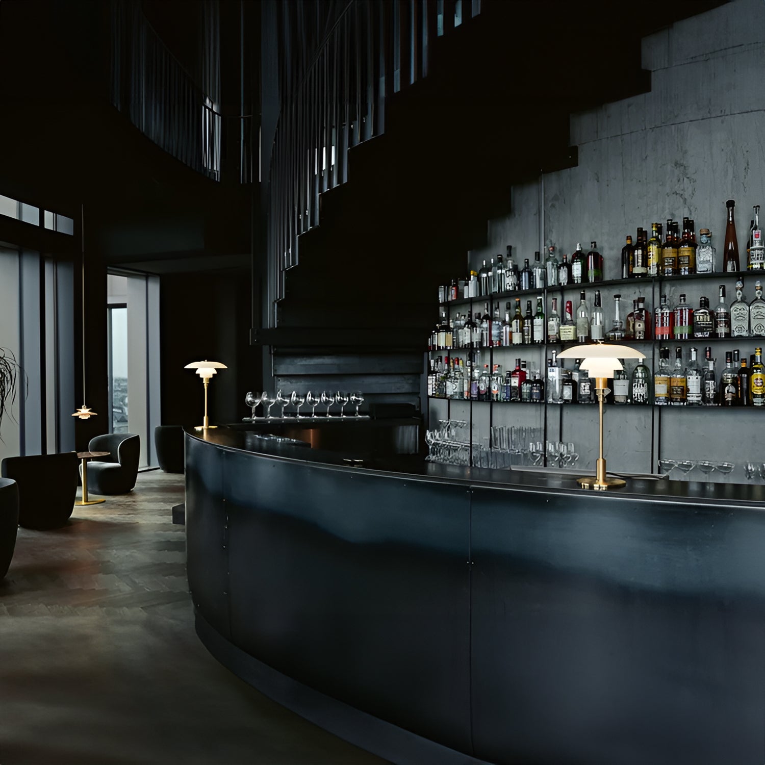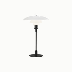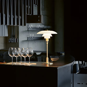 The fixture is designed based on the principle of a reflective three-shade system, primarily directing the light downwards. The shades are made of hand-blown opal three-layer glass, with a glossy surface on top and a sandblasted matte finish on the underside, providing a soft and even light distribution.