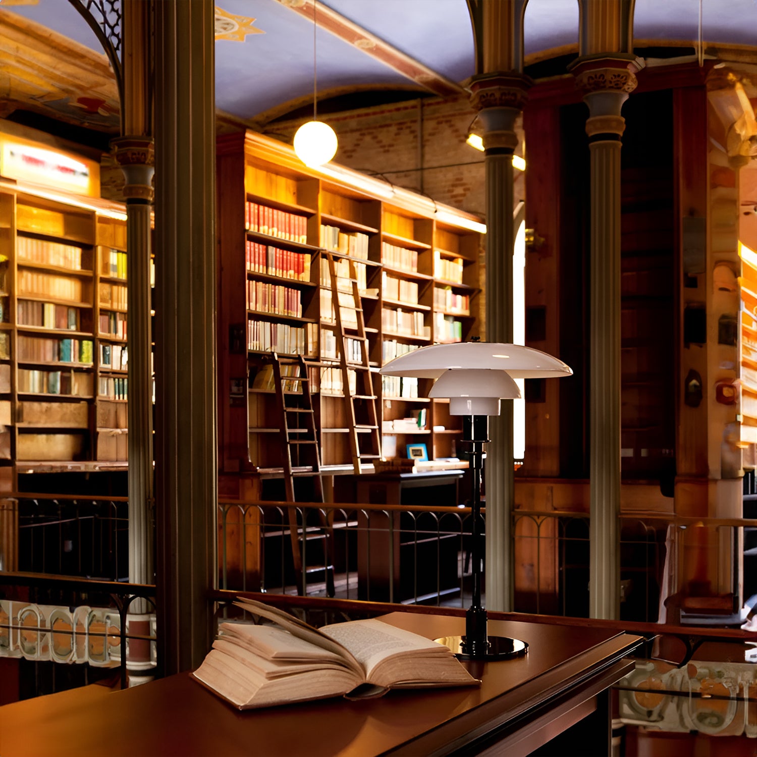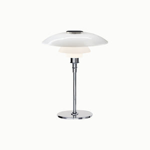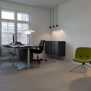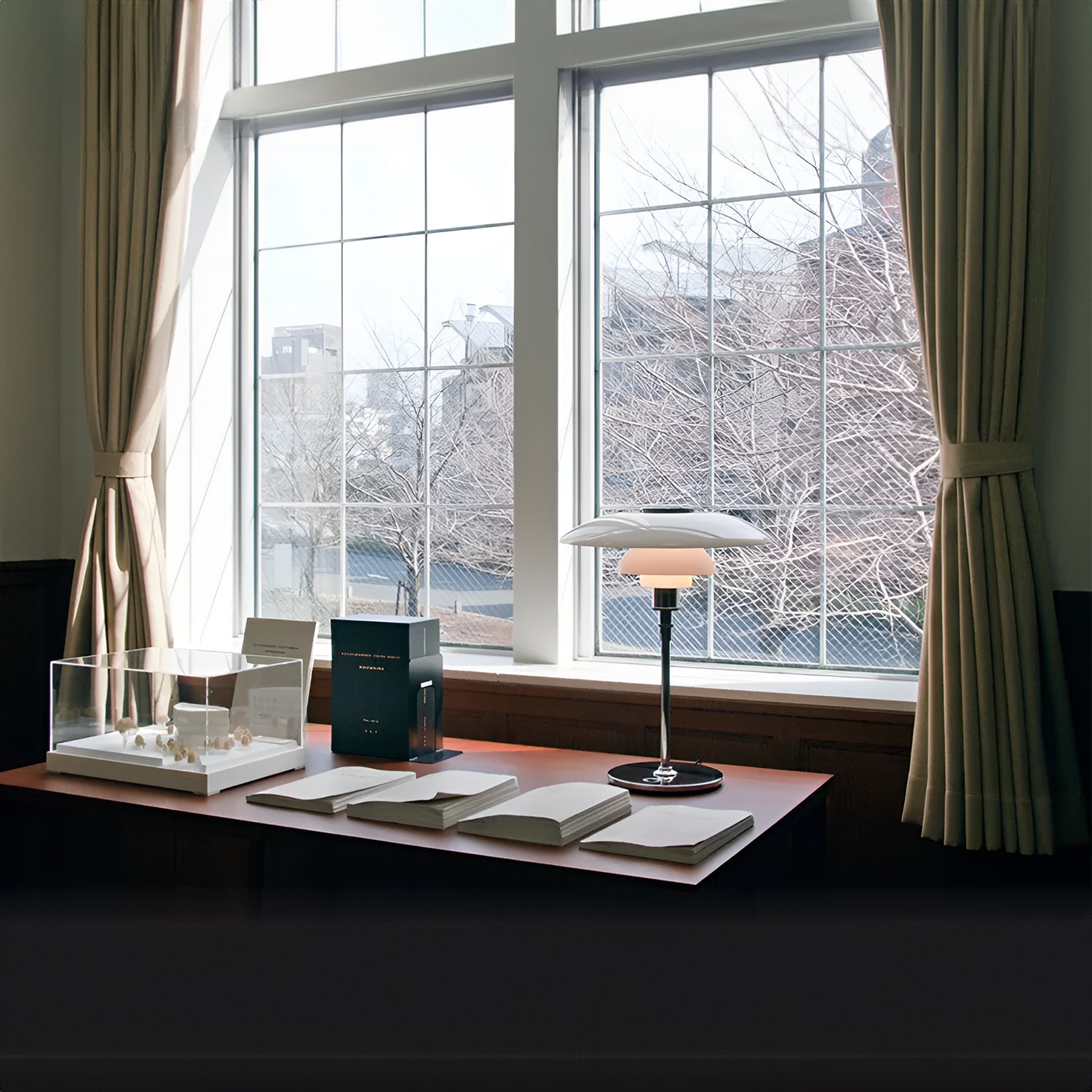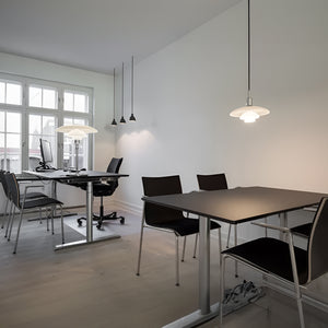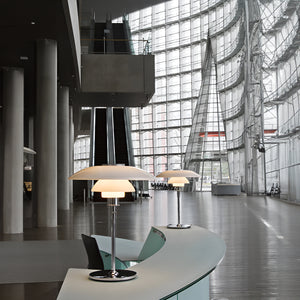 The fixture is designed based on the principle of a reflective three-shade system, primarily directing the light downwards. The shades are made of hand-blown opal three-layer glass, with a glossy surface on top and a sandblasted matte finish on the underside, providing soft and even light distribution.