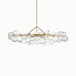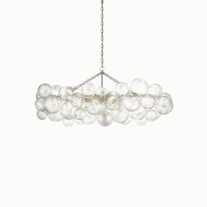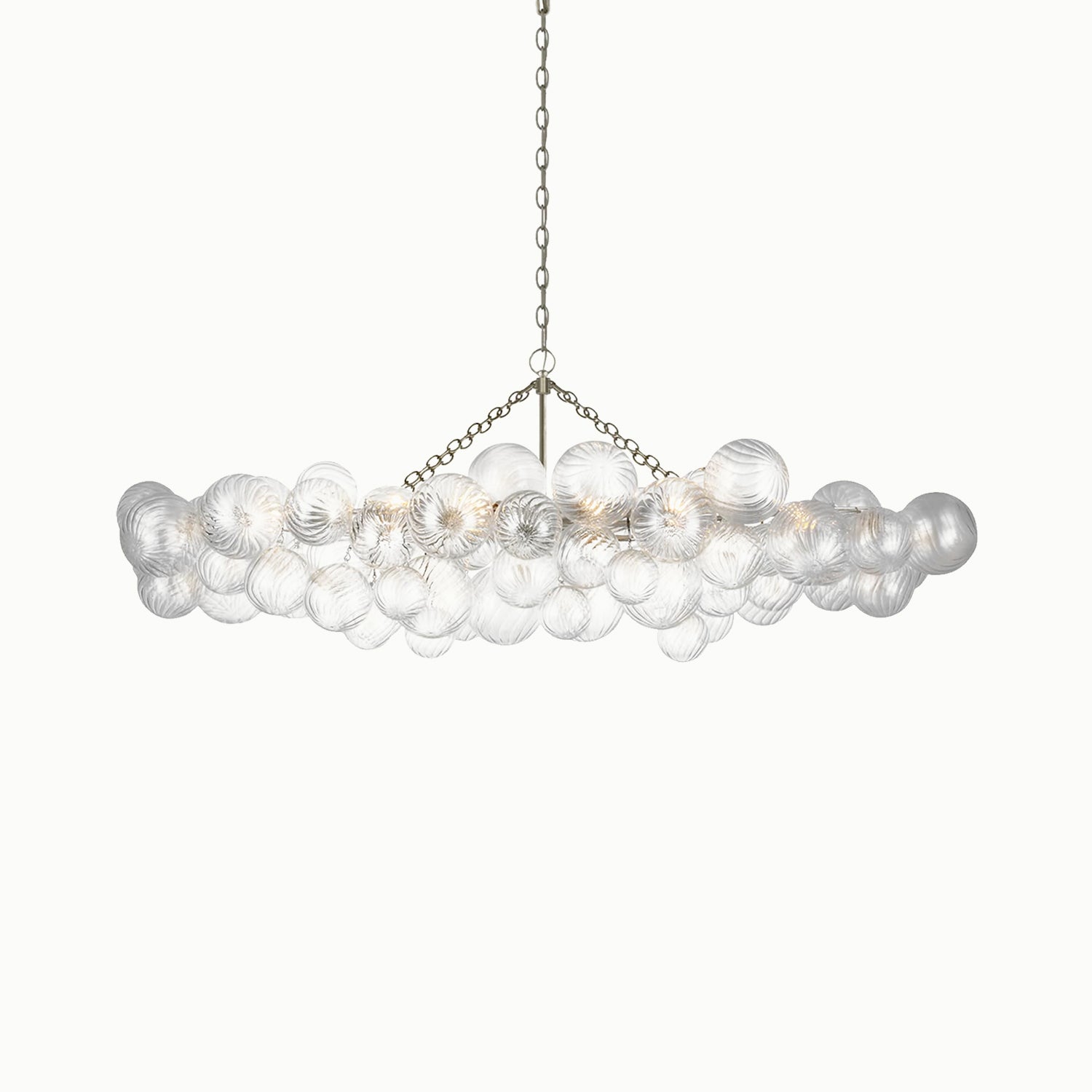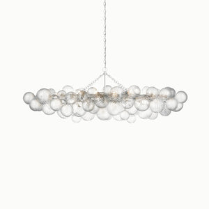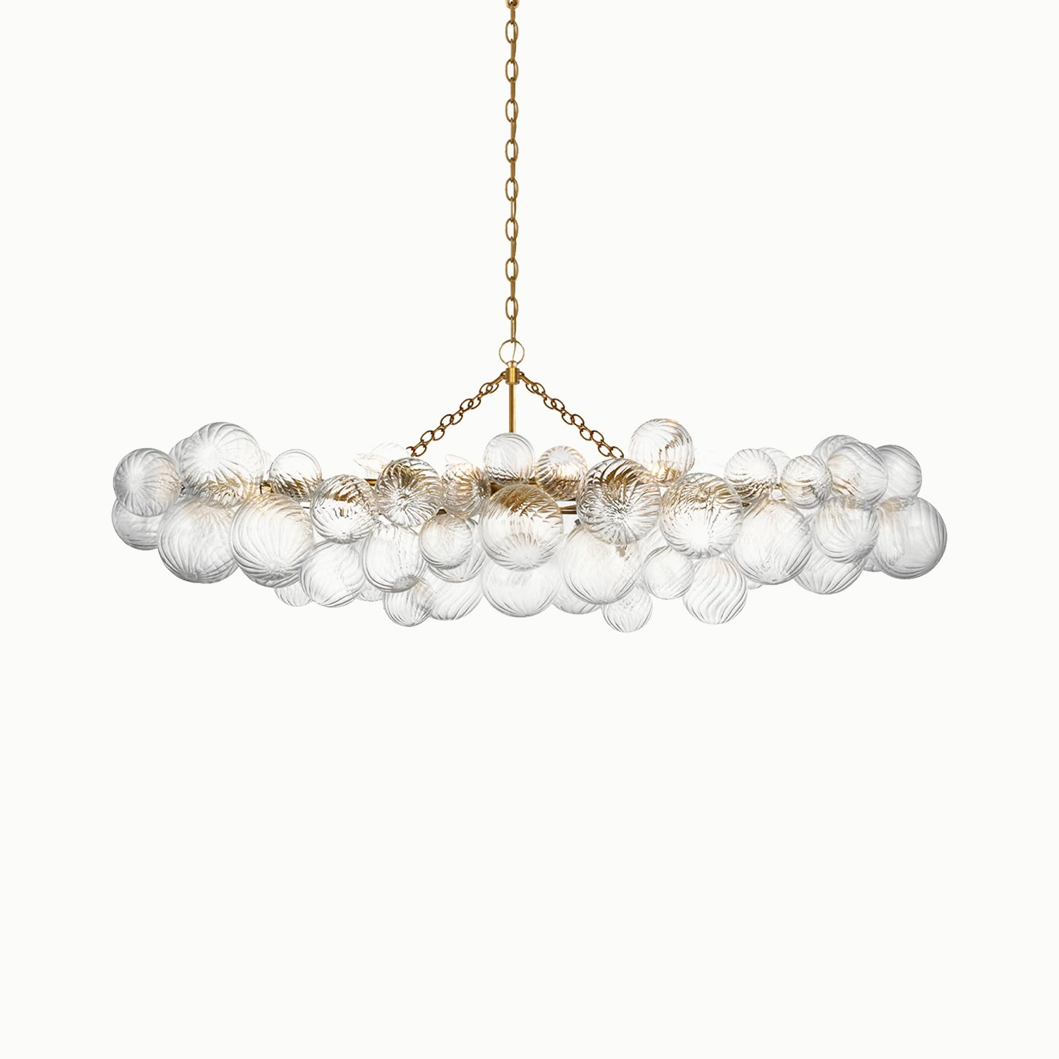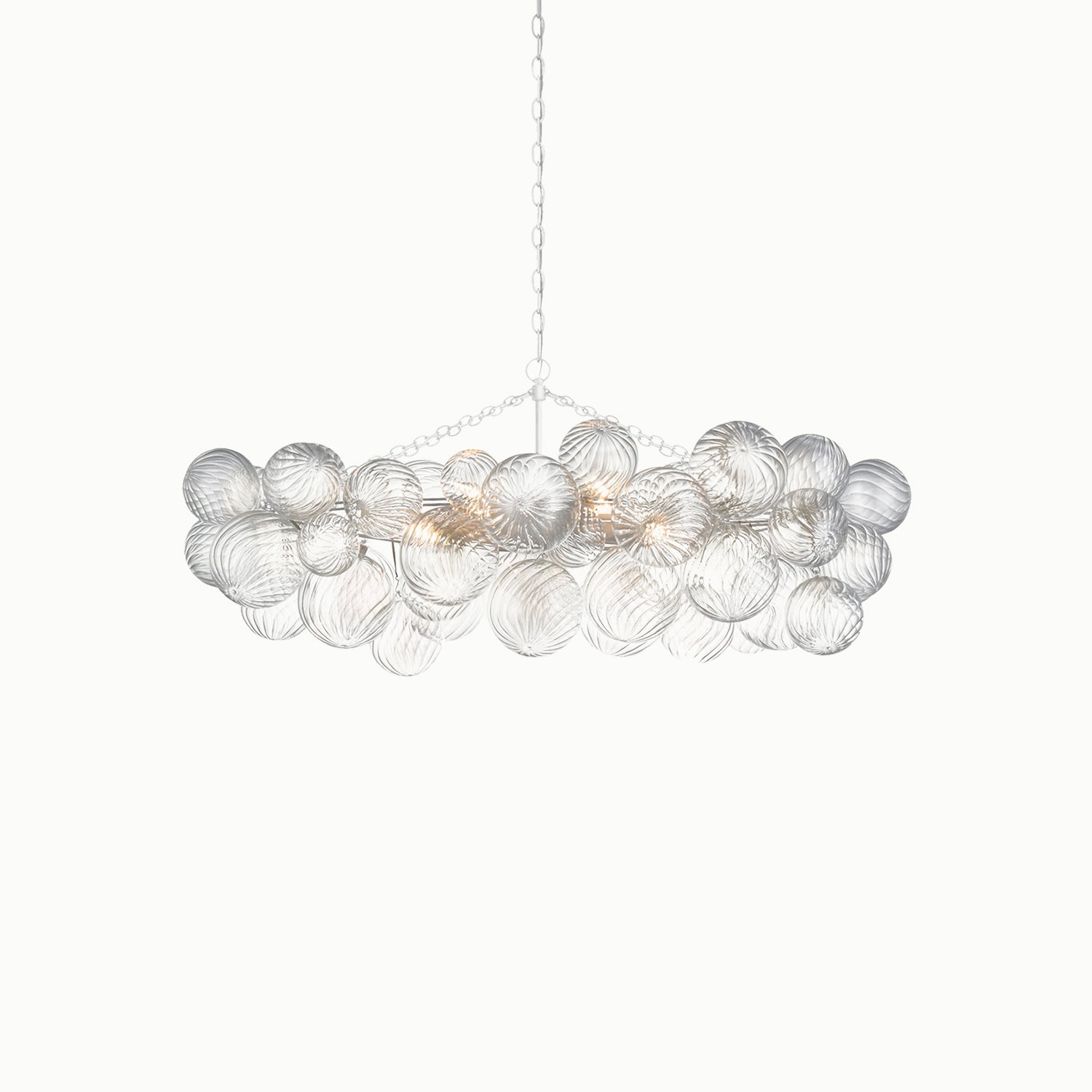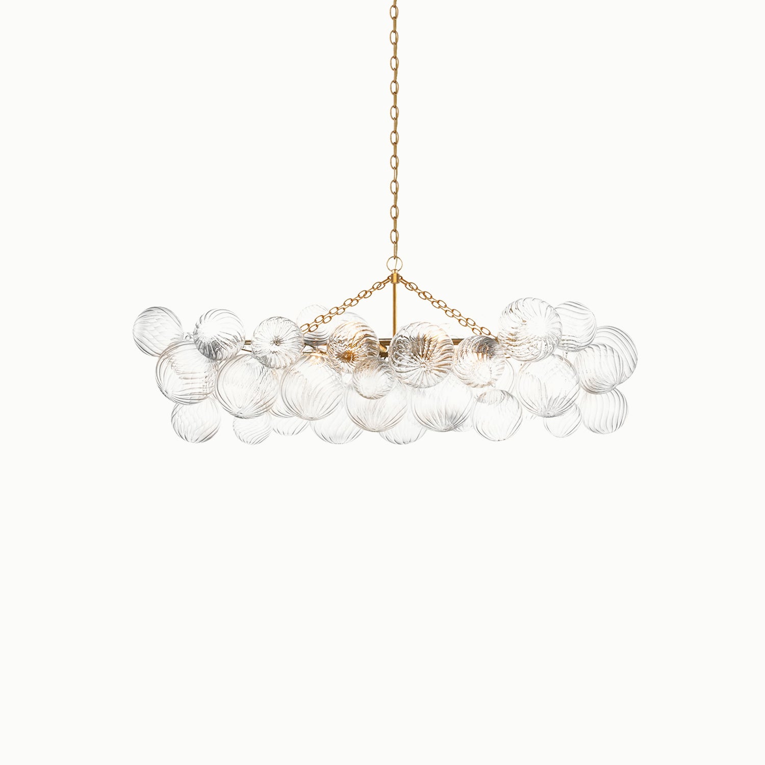 Handcrafted glass elevates the Talia series, bringing a fresh twist to the simple glass globe light fixture. Light sparkles through multiple swirling glass orbs attached to metal baskets, creating a whimsical atmosphere. The Talia series offers a variety of sizes and configurations, adding a dynamic mix of sparkling glass, rounded shapes, and bright metals to any interior decor.Choose a chandelier for entryways and dining areas, a flush-mount, or a wall sconce for living spaces or bedrooms, adding a playful, feminine touch to any space.
