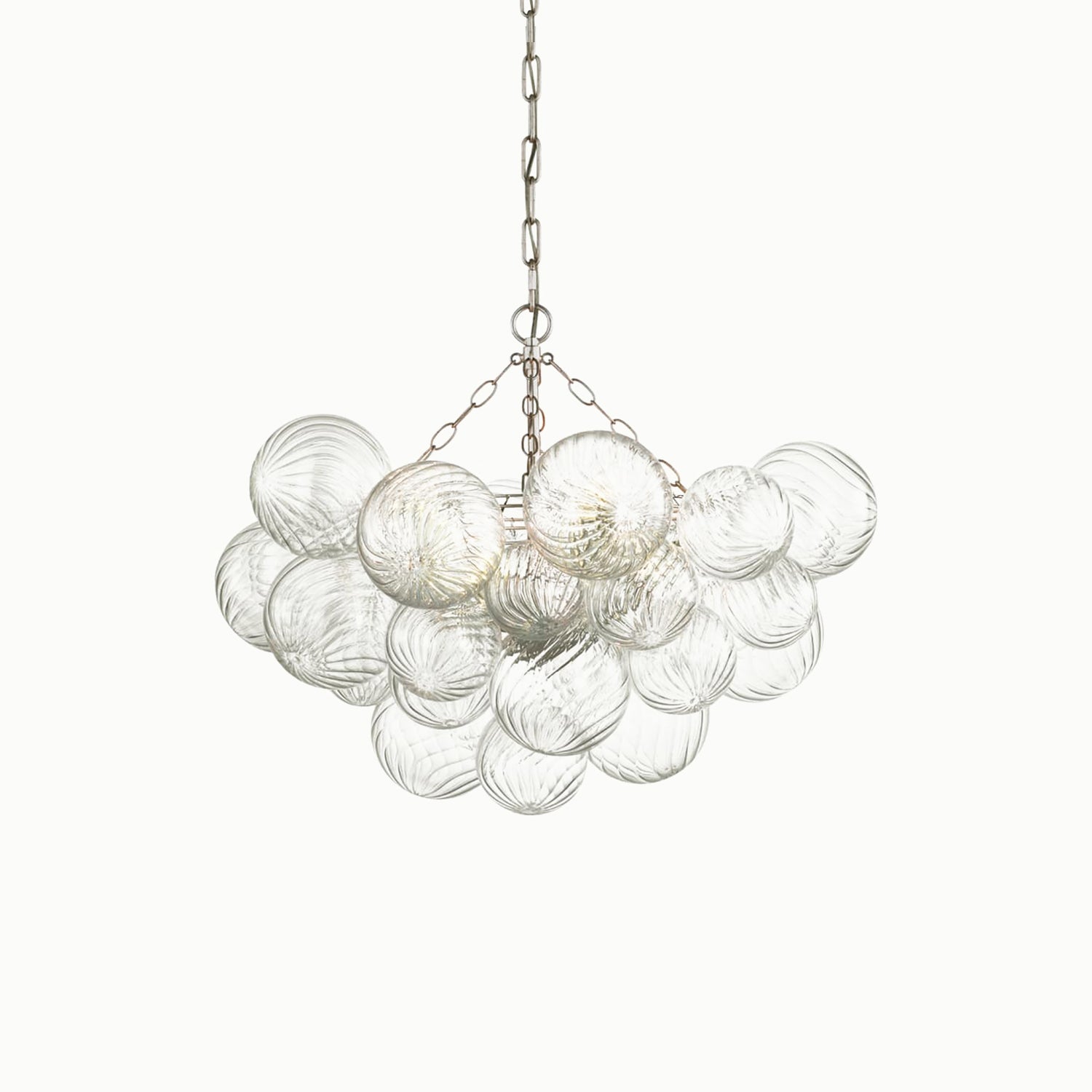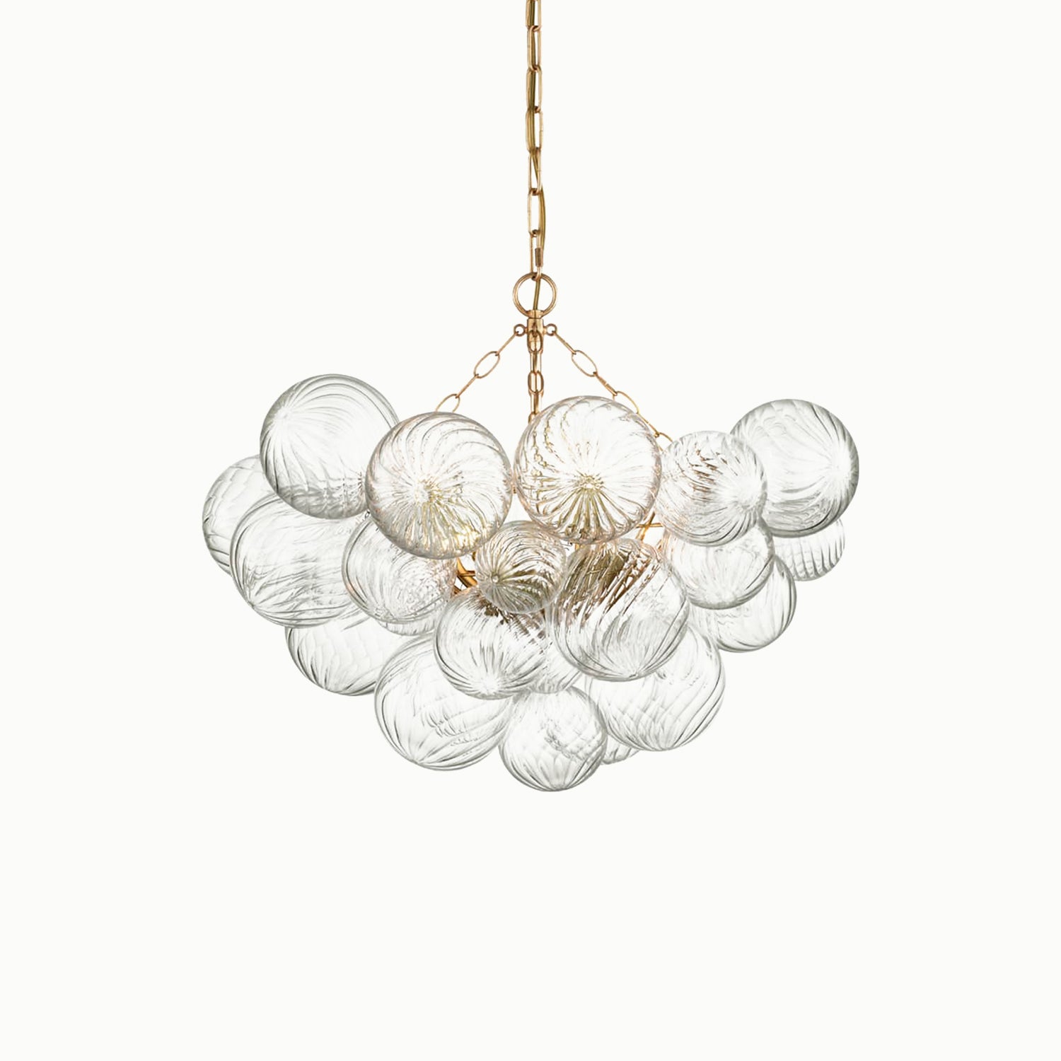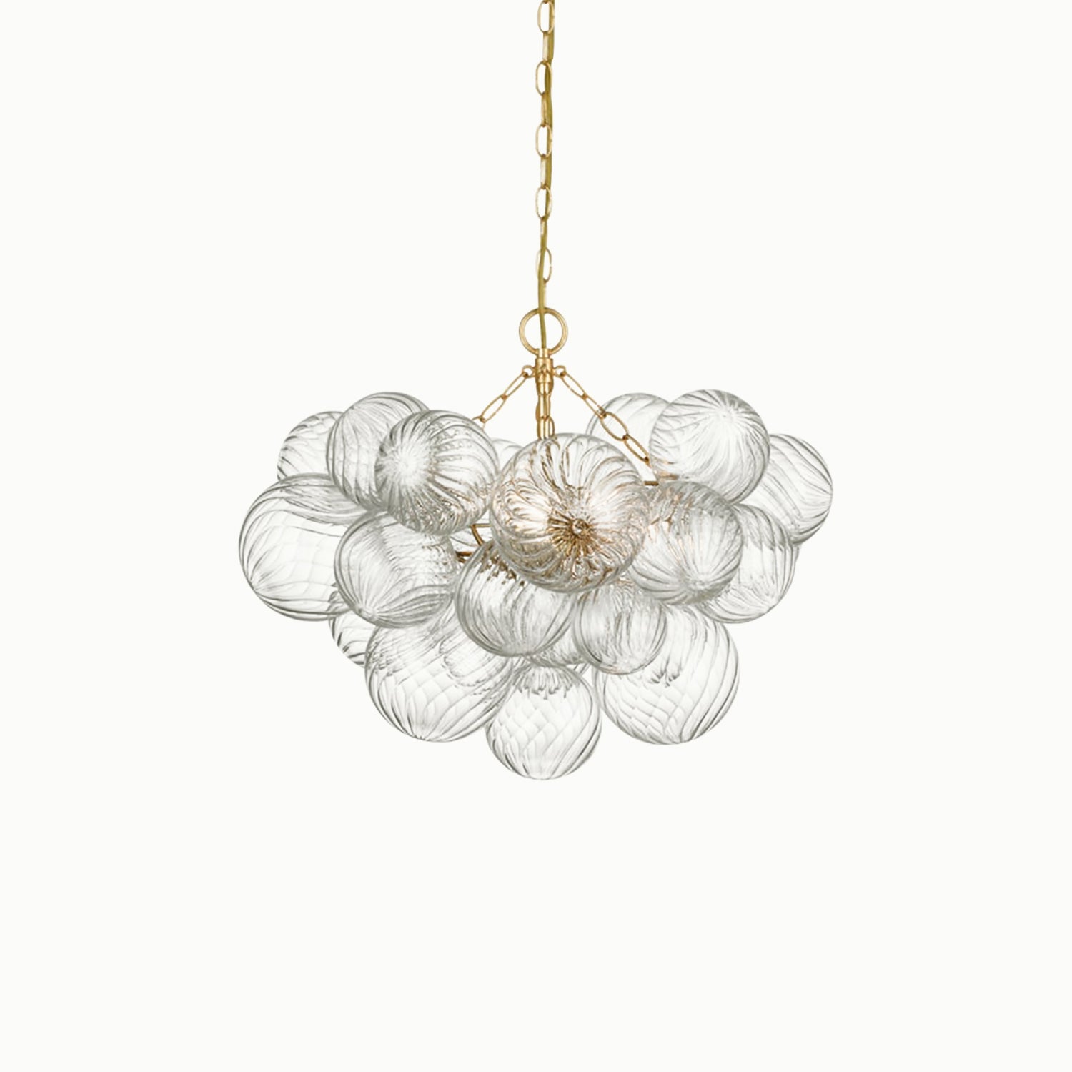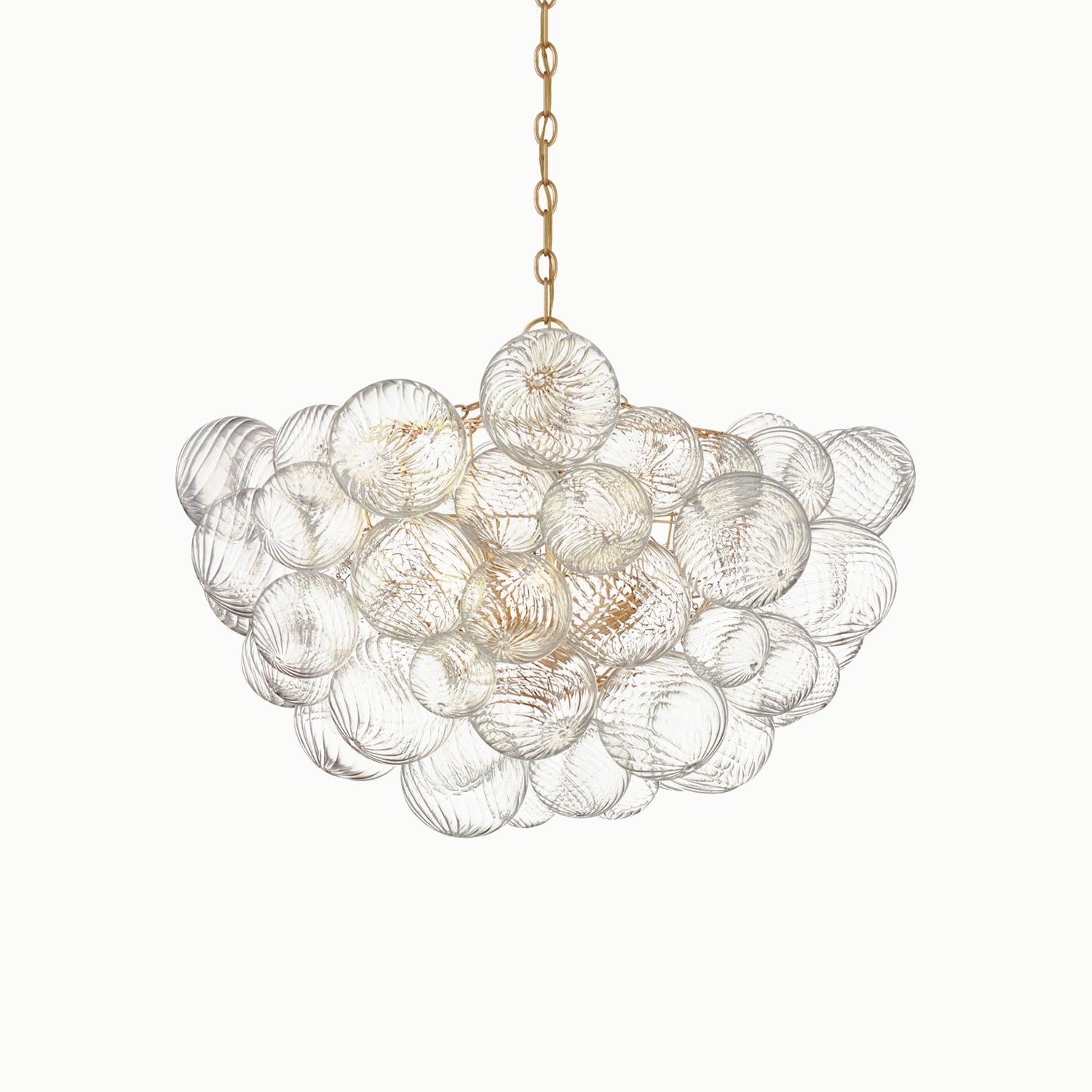 Handcrafted glass elevates a series of designs, giving new life to simple glass ball fixtures. Light flickers through multiple swirling glass orbs fixed in a metal basket, creating a whimsical atmosphere. The series offers various sizes and configurations, adding a dynamic combination of sparkling glass, round shapes, and bright metal to any interior space. Choose pendant lights for entryways and dining areas, or opt for recessed or wall lights for living spaces or bedrooms, adding a playful, feminine touch to any environment.