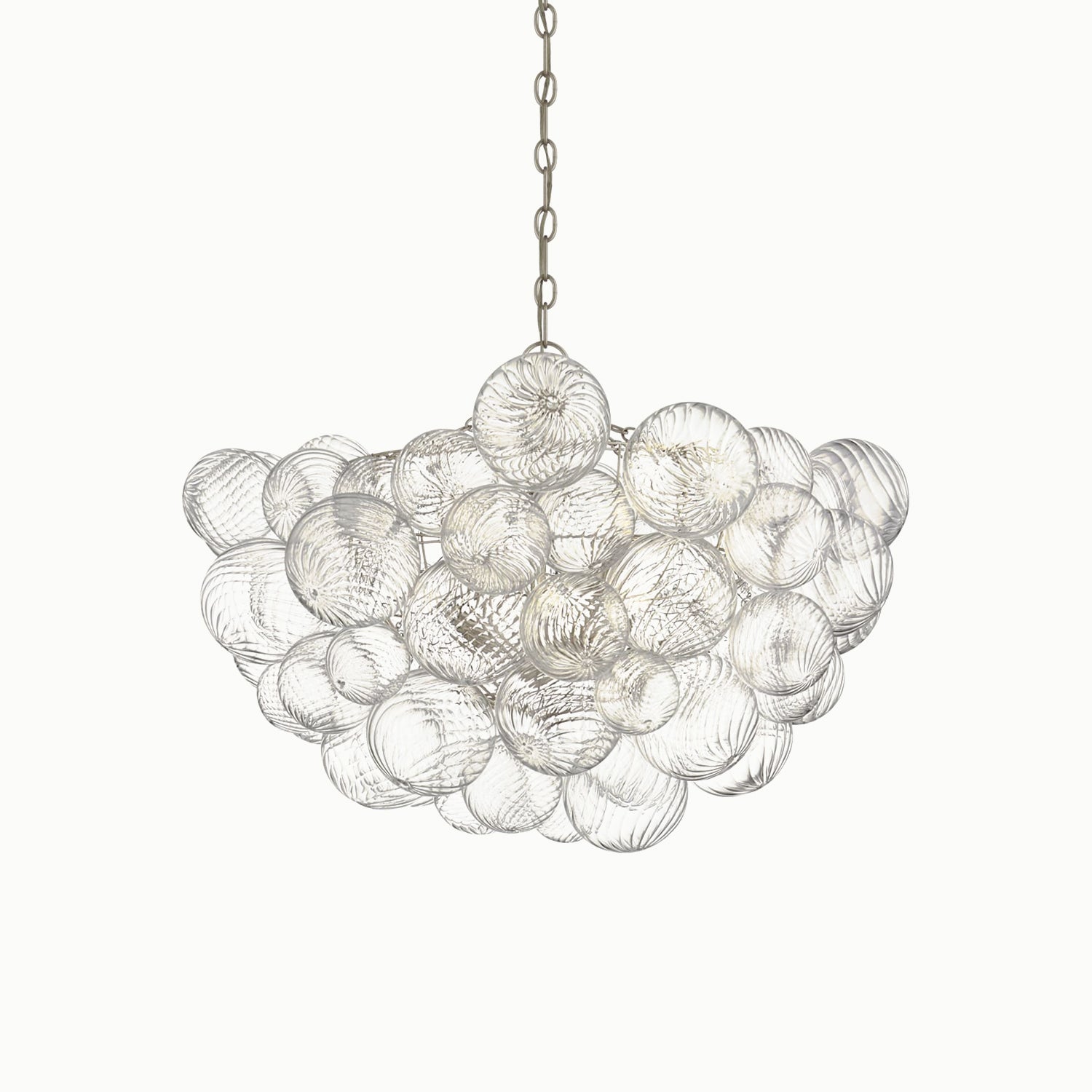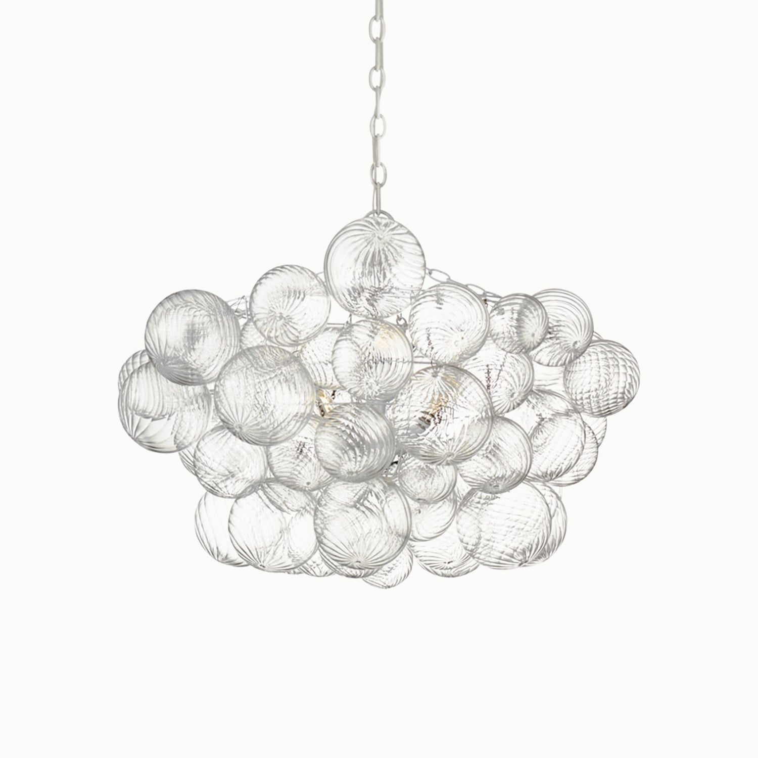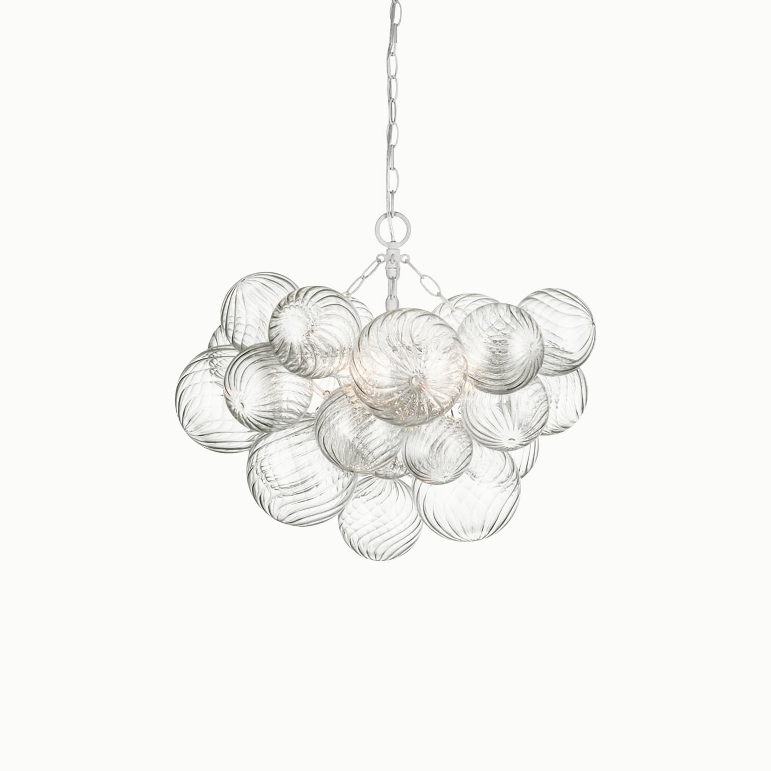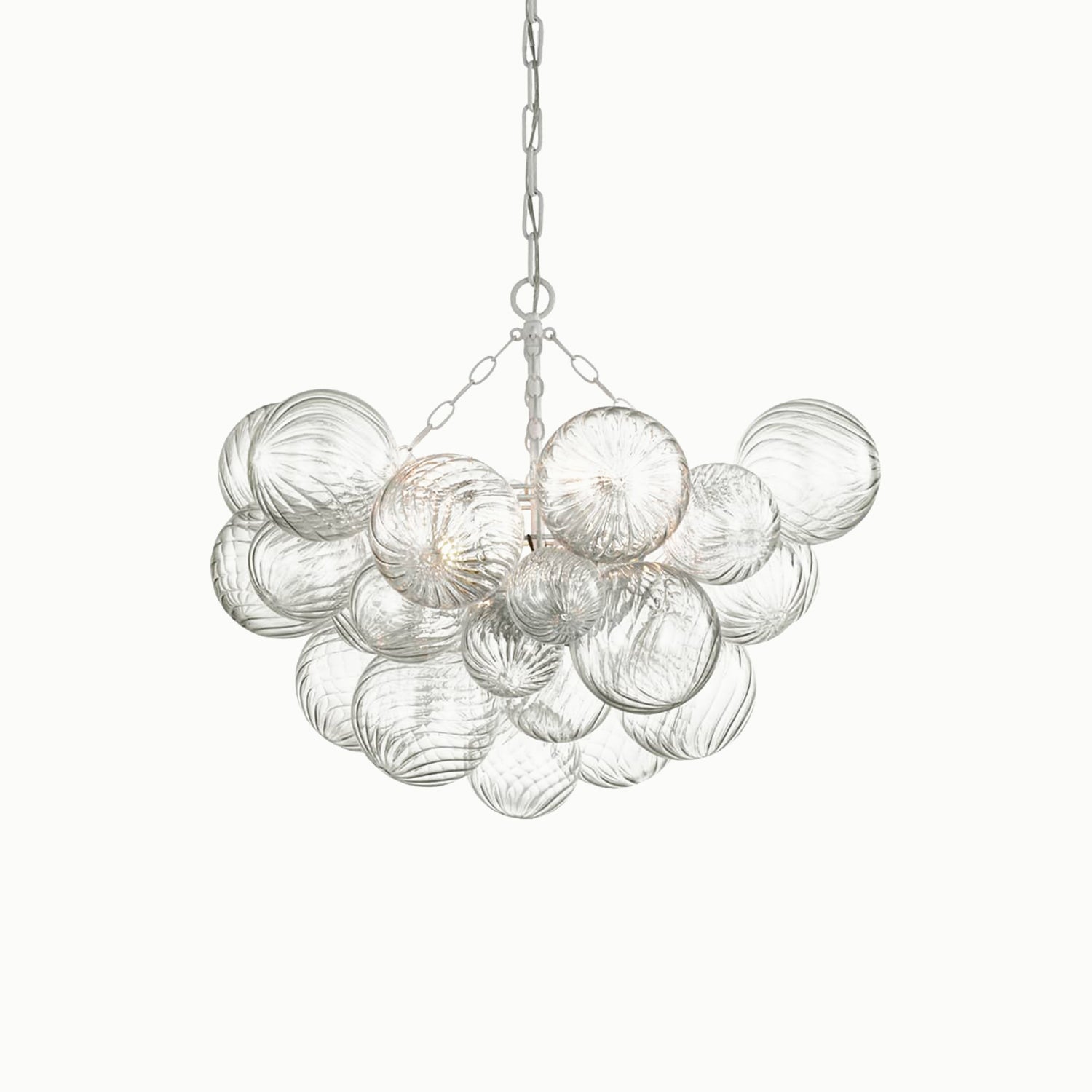 Handcrafted glass elevates a series of designs, giving new life to simple glass ball fixtures. Light flickers through multiple swirling glass orbs fixed in a metal basket, creating a whimsical atmosphere. The series offers various sizes and configurations, adding a dynamic combination of sparkling glass, round shapes, and bright metal to any interior space. Choose pendant lights for entryways and dining areas, or opt for recessed or wall lights for living spaces or bedrooms, adding a playful, feminine touch to any environment.